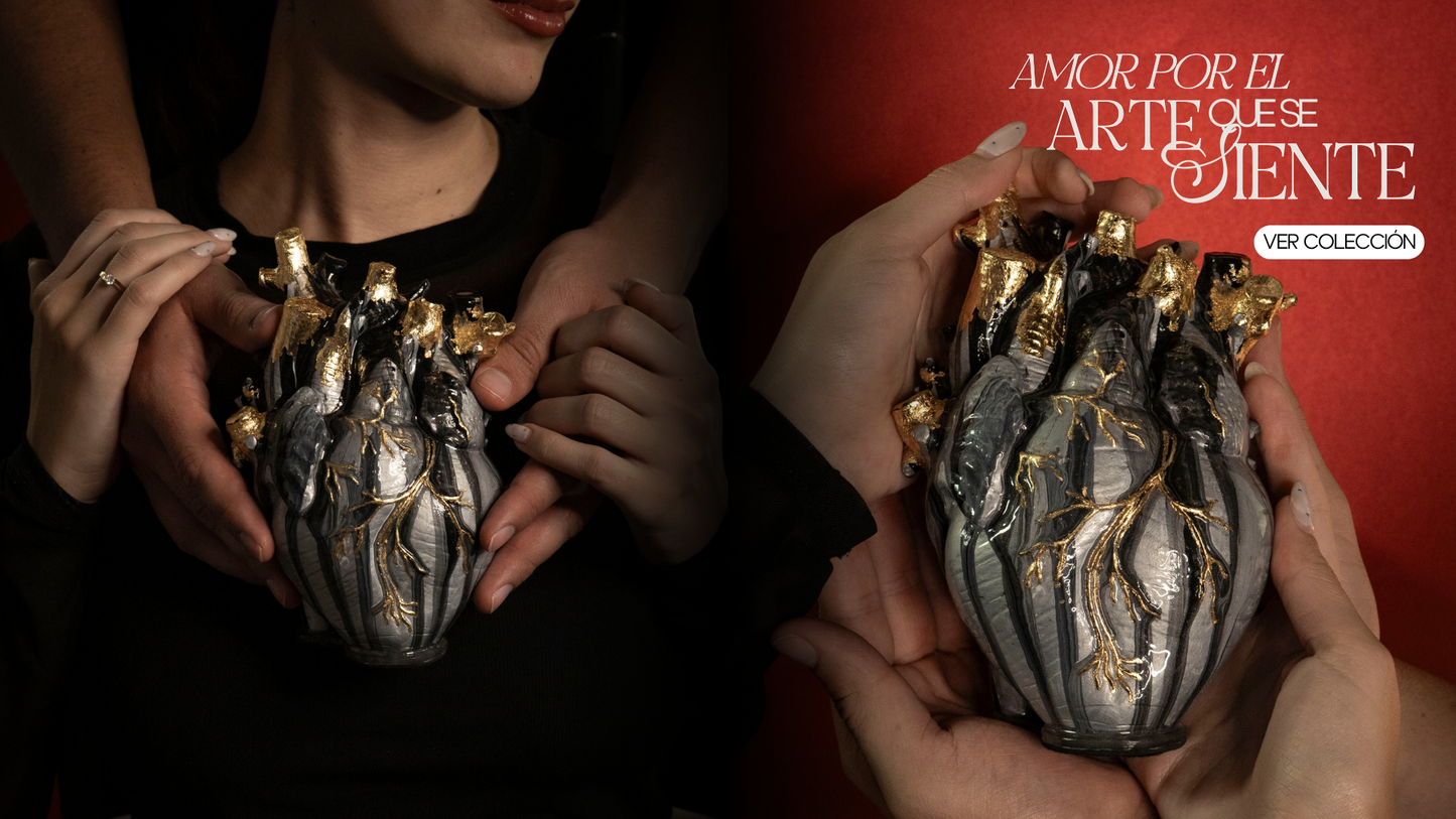 Cada pieza nace de la cueva de la fábrica en Villa de Leyva, un espacio que se volvió templo creativo y punto de partida de esta colección. Allí se dio forma a 21 corazones numerados, concebidos como reliquias contemporáneas.