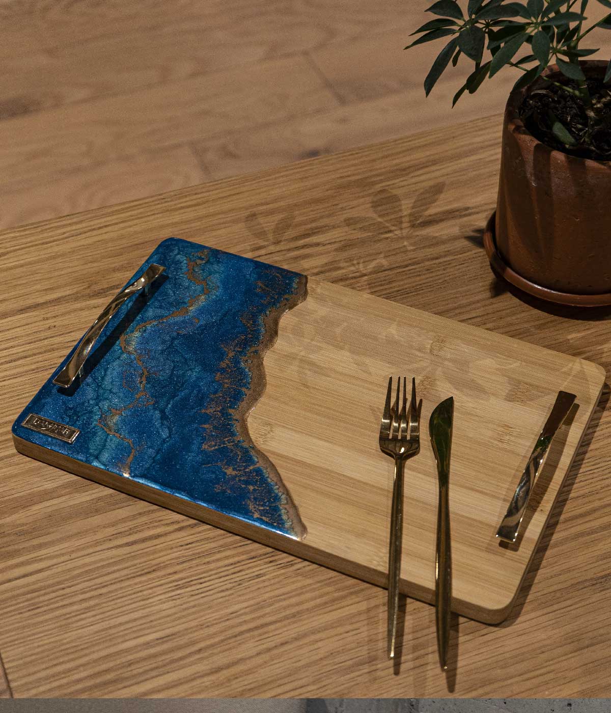 Bandeja para servir con un hermoso diseño de resina a un extremo dejando ver la madera al otro lado.