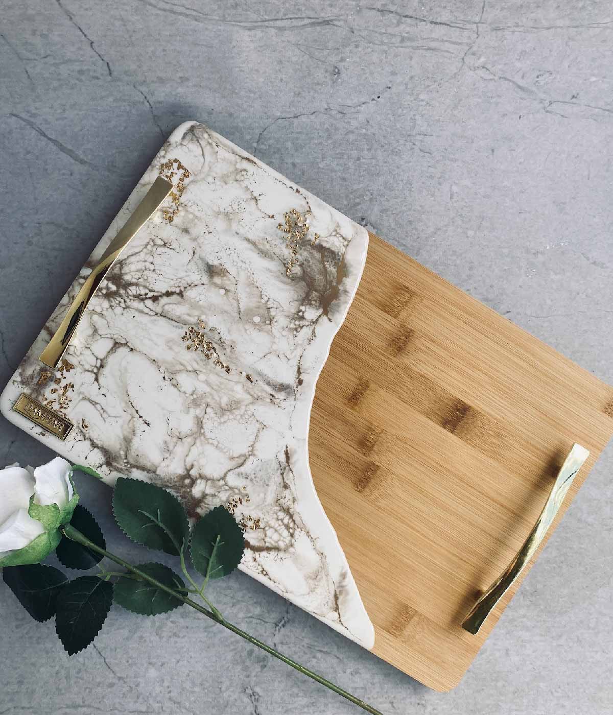 Bandeja para servir con un hermoso diseño de resina a un extremo dejando ver la madera al otro lado.