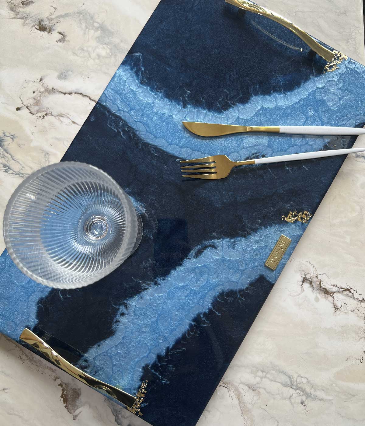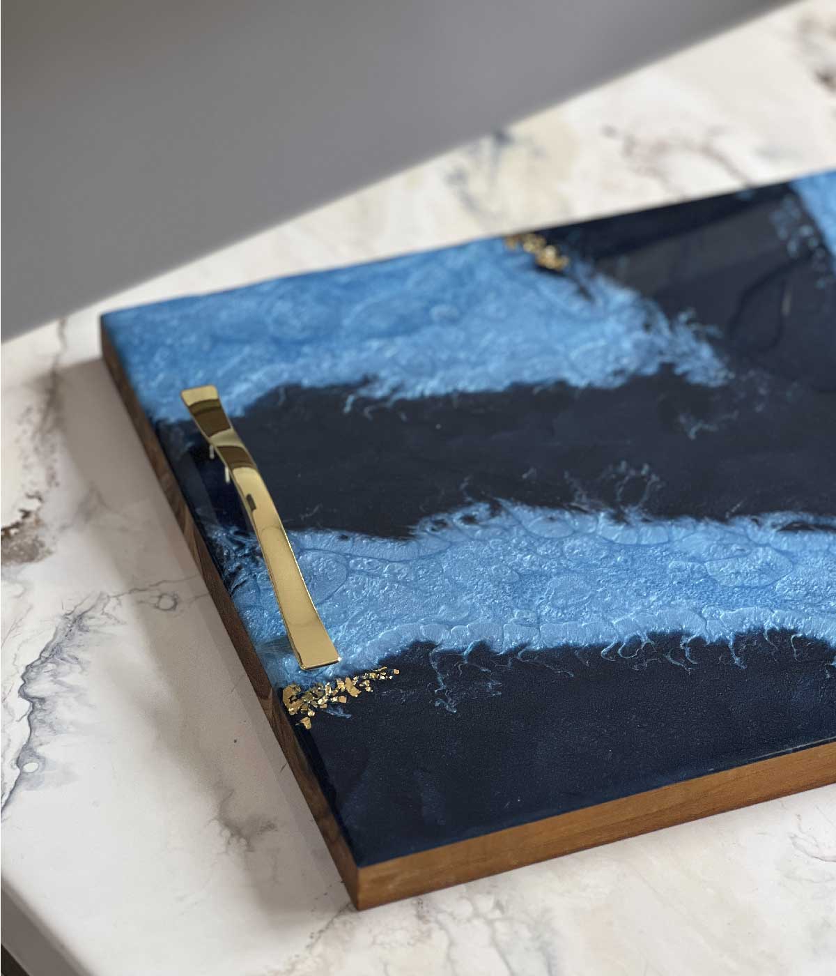 Hermosa bandeja, grande e imponente perfecta para servir a tus comensales en color negro con vetas doradas y laminilla dorada