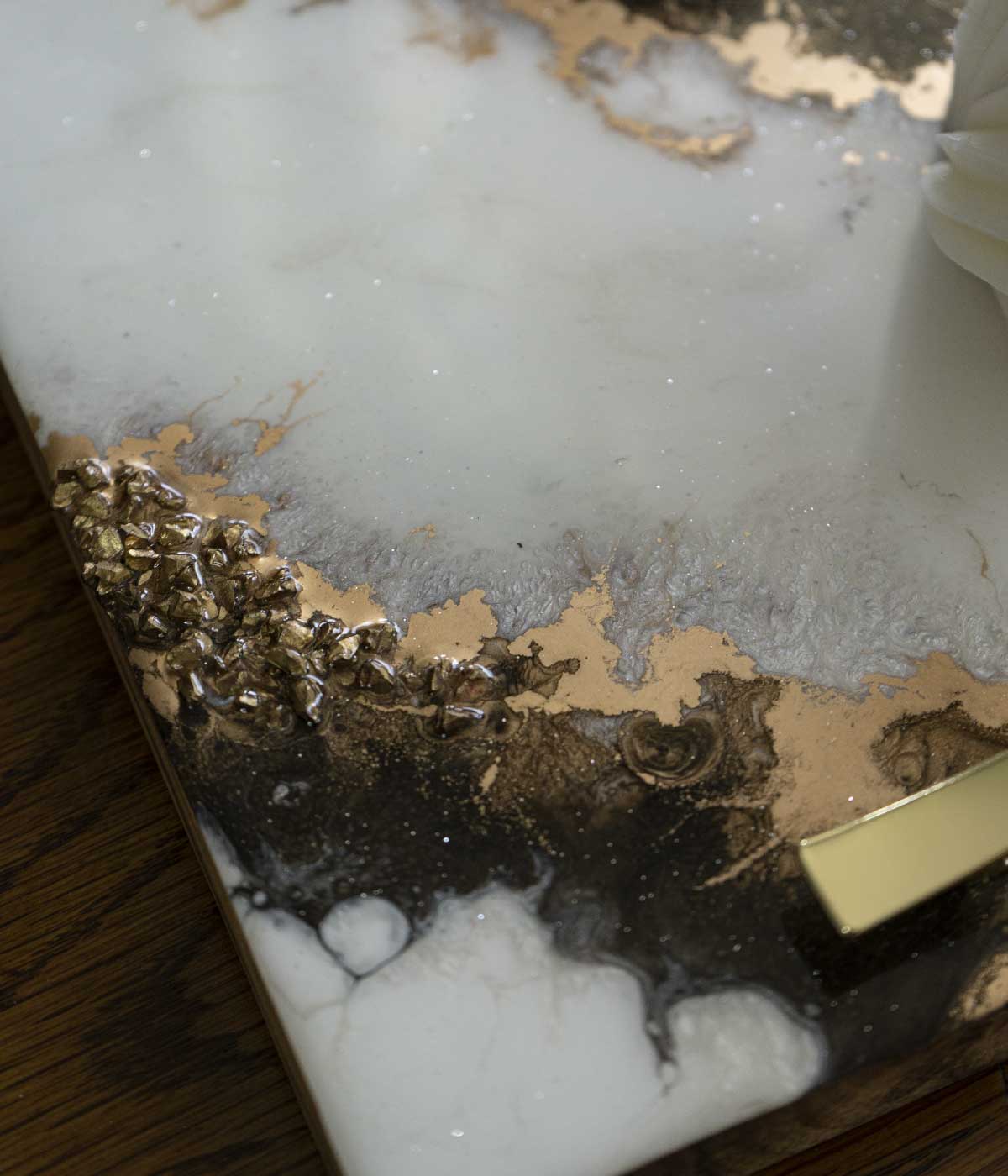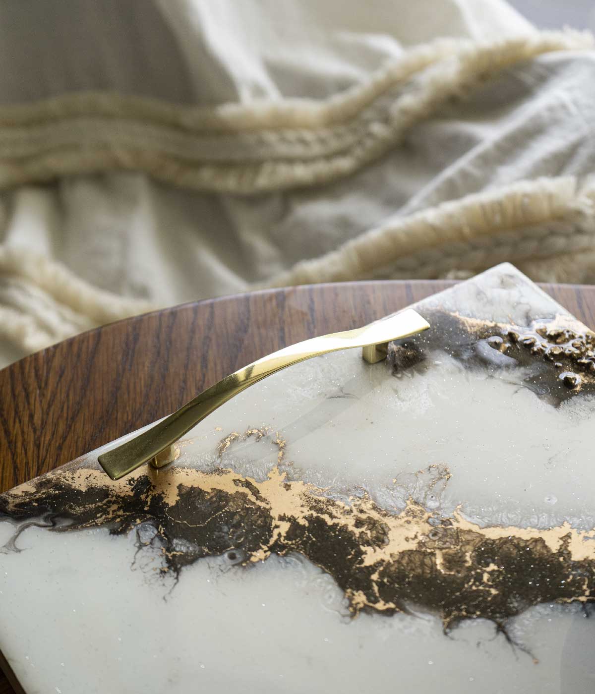 Hermosa bandeja para servir en forma rectangular con base de madera y cubrimiento en resina.