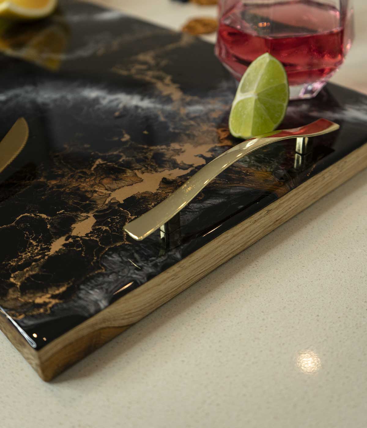 Hermosa bandeja para servir en forma rectangular con base de madera y cubrimiento en resina.