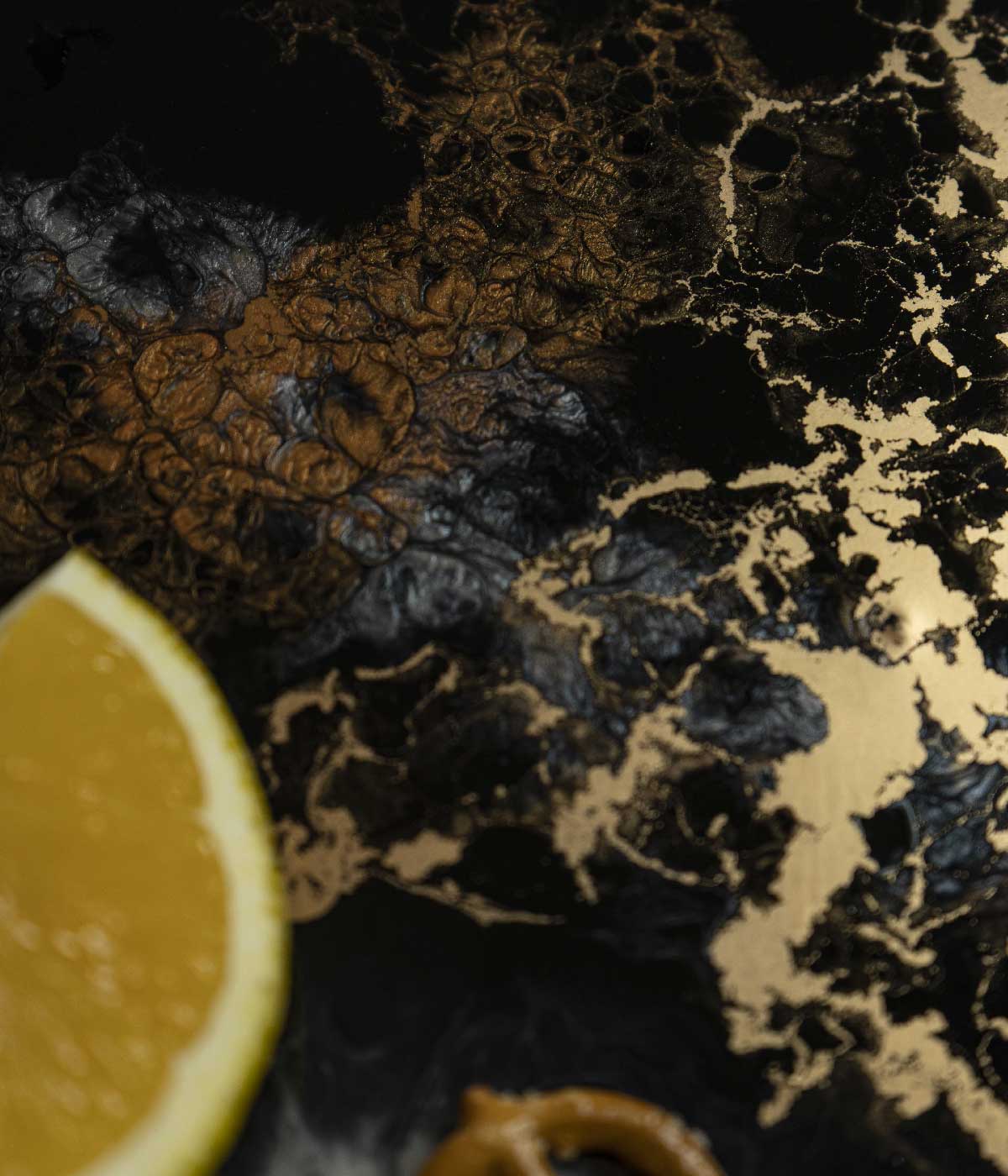 Negro, dorado, blanco, plateado y bronce en diseño marmolado.
