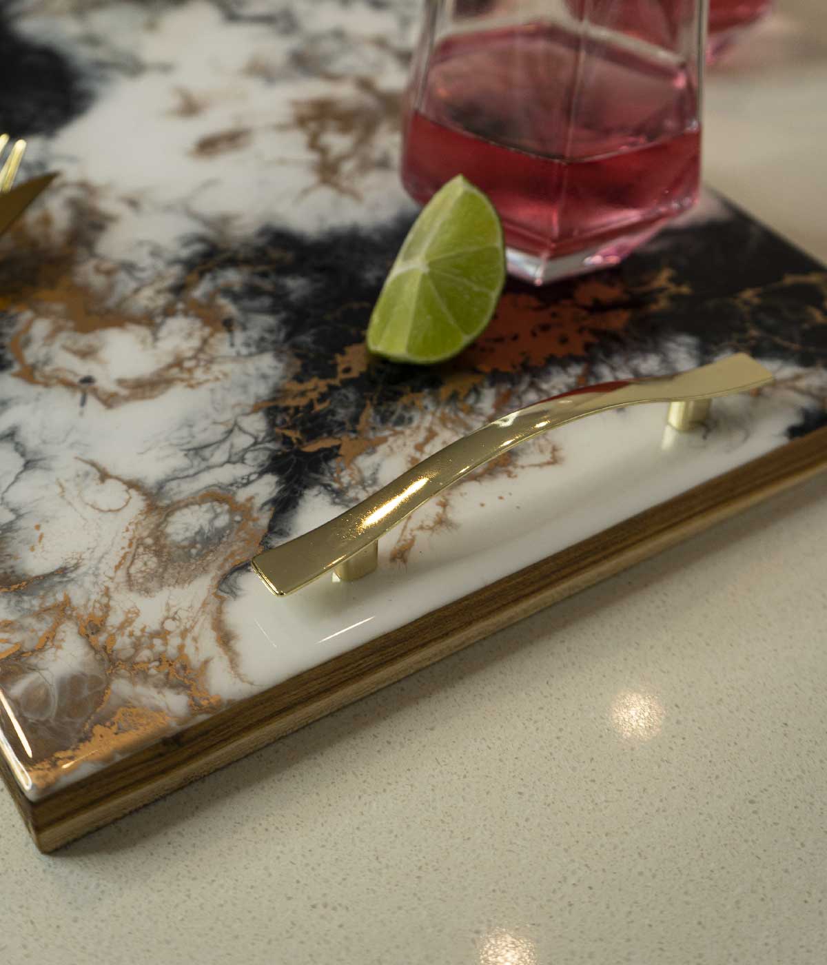 Hermosa bandeja para servir en forma rectangular con base de madera y cubrimiento en resina.