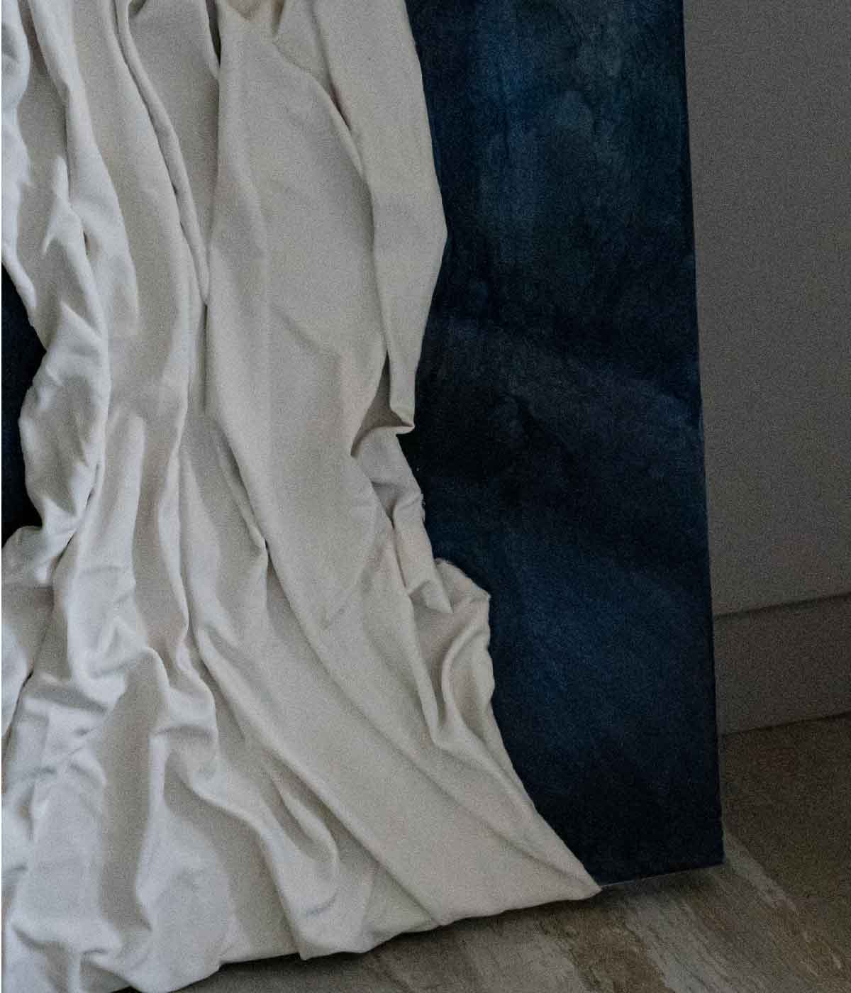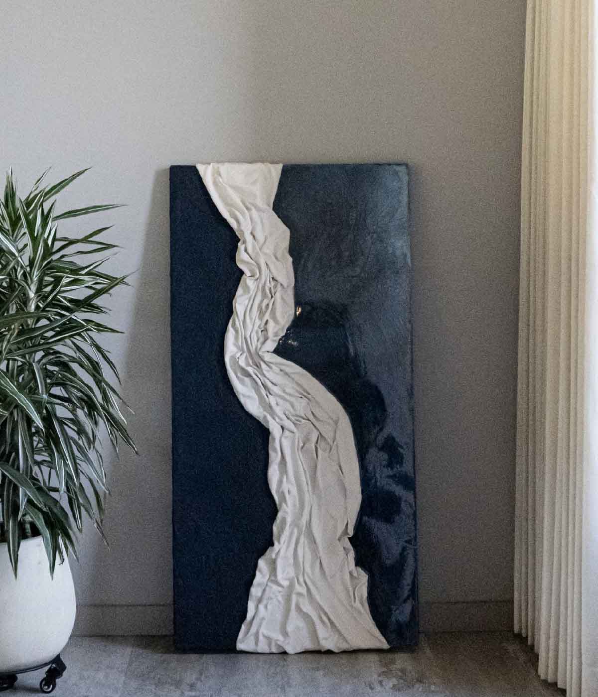 Este cuadro presenta un diseño contemporáneo y elegante que combina texturas y contrastes visuales de forma armónica. Sobre un fondo en tonos azul profundo con patrones orgánicos sutiles —que evocan movimientos acuáticos o formaciones minerales— se despliega una tela blanca drapeada con caída natural, que atraviesa la obra de forma fluida y dinámica, creando un efecto visual de movimiento.