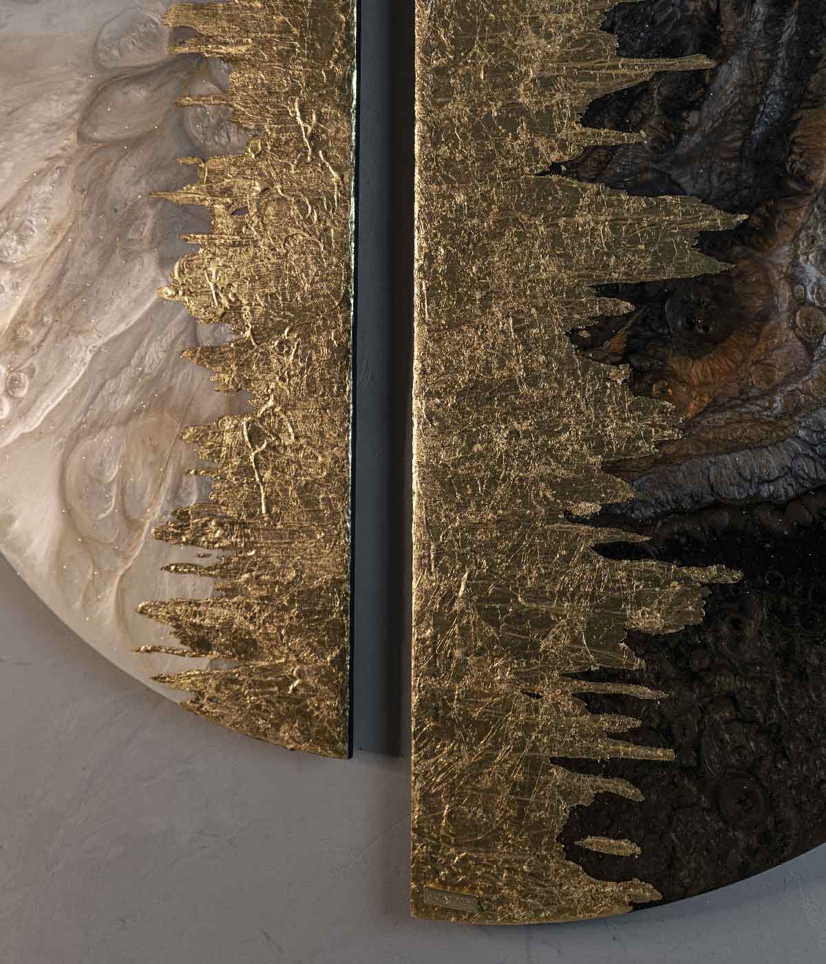 Fungo, inspirada en el mundo de los hongos, sus colores y texturas, la combinación de colores nudes y negro crea un contraste llamativo y equilibrado, mientras que el efecto dorado agrega un toque de brillo y lujo. Las formas geométricas semicirculares le dan a la pieza un aspecto dinámico y orgánico, creando una sensación de movimiento y fluidez. Este cuadro es perfecto para espacios contemporáneos y minimalistas, ya que su diseño sencillo y elegante complementa la estética de estos ambientes. Además, la calidad de los materiales utilizados garantizan que esta pieza sea duradera y resistente al paso del tiempo.