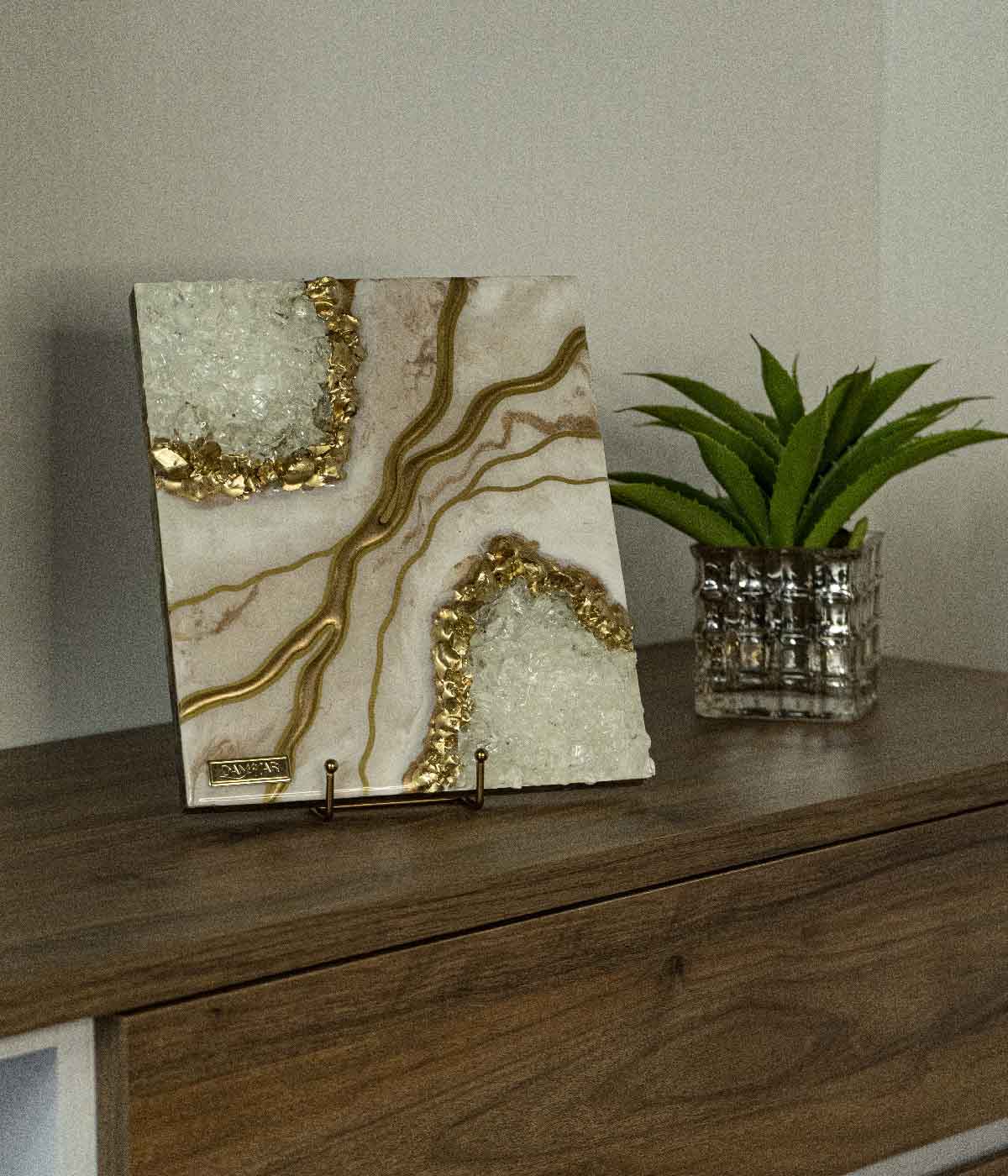 Material: Resina  Incluye base dorada para mesas Medida: 26x23 cm  Hecho a mano