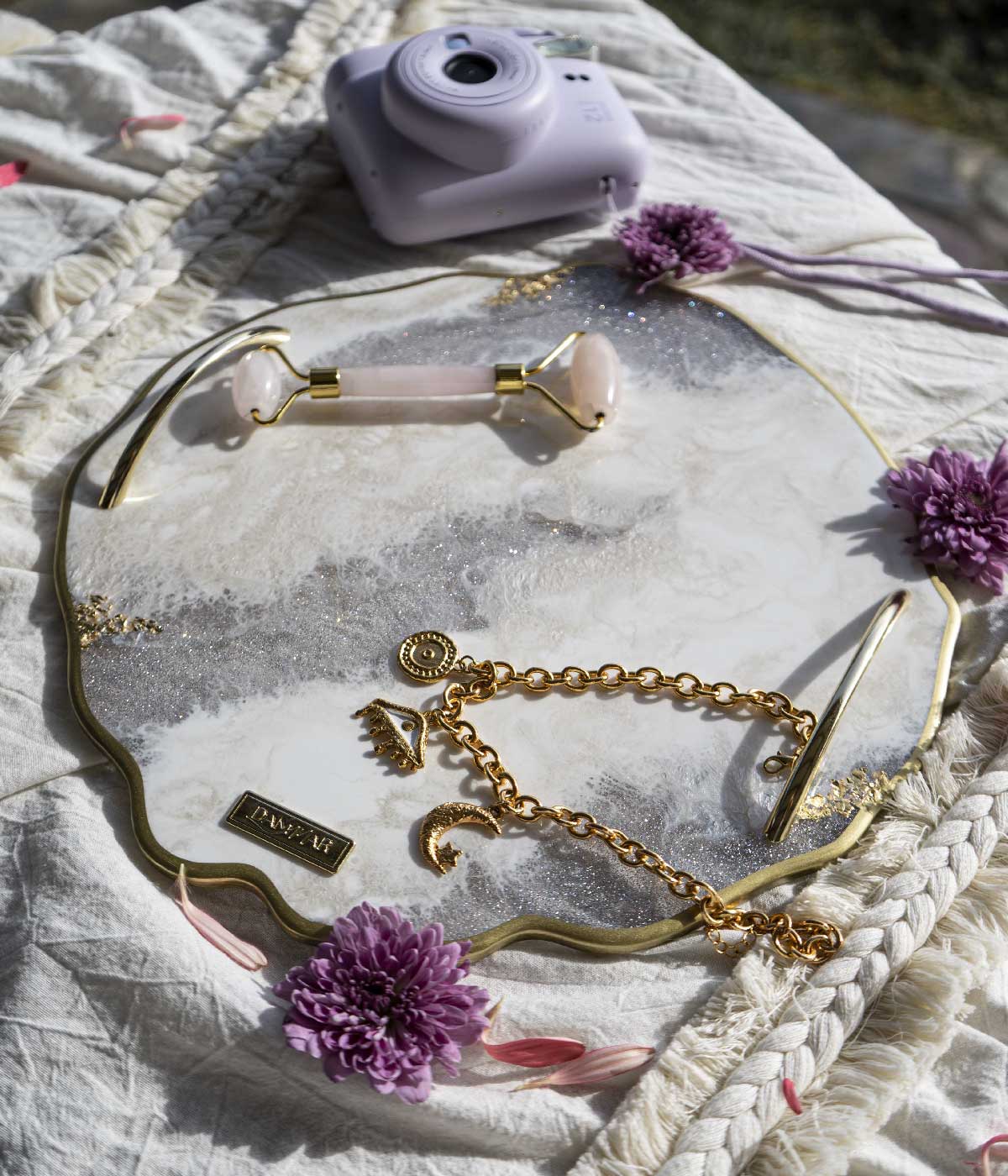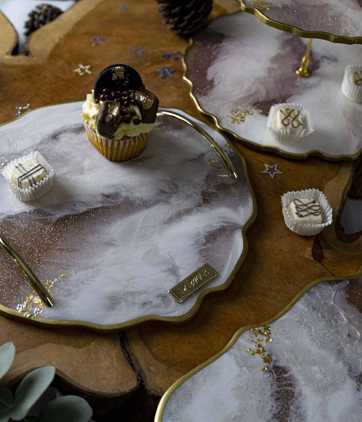 Hermosa bandeja, elegante y versátil que te puede servir como complemento decorativo, bandeja para servir, centro de mesa, estación de café o condimentos en tu cocina, base para tus perfumes y mucho más!  Elígela en el tamaño que más te guste y puedes llevarla con o sin manijas... Medidas: 25 cm - 32 cm de diametro  Material: Resina Manijas: Zamak Hecho a mano