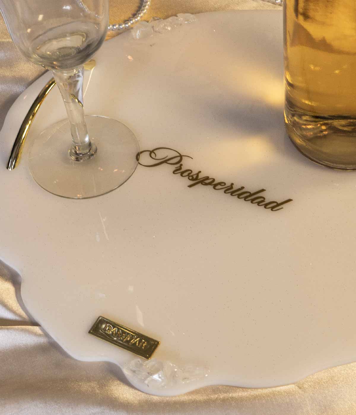 Diseñada para aportar armonía y propósito a tu espacio, esta bandeja está intervenida con cuarzos naturales y una palabra grabada que simboliza un deseo para tu hogar: Amor, Abundancia, Felicidad, Prosperidad, Salud o Paz.