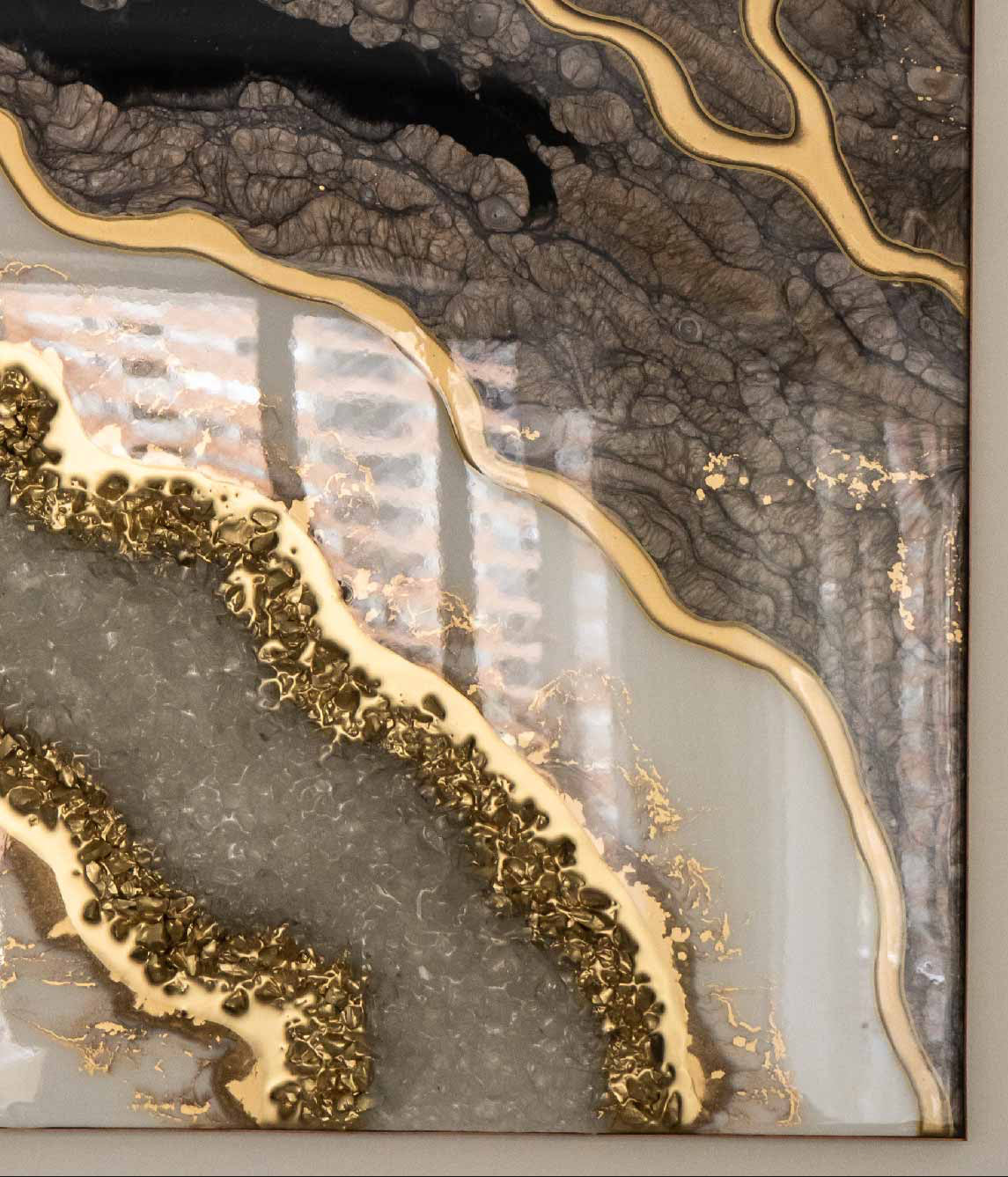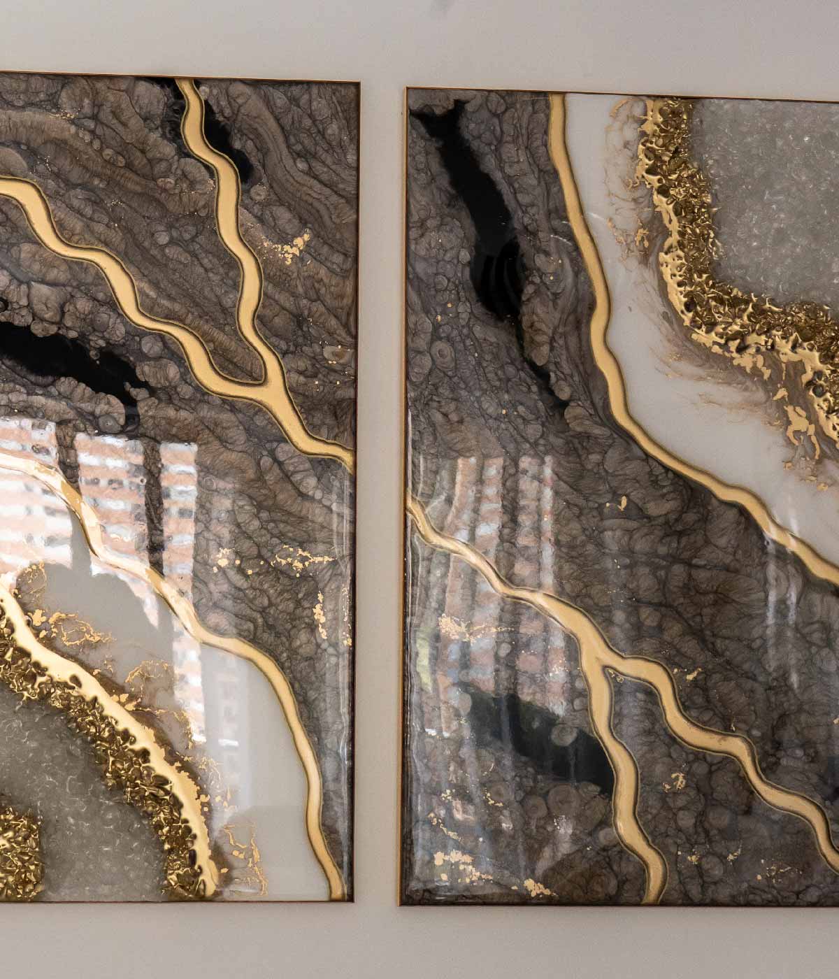 Hermosos cuadros trípticos con diseño abstracto en diferentes tonos grises con blanco y dorado