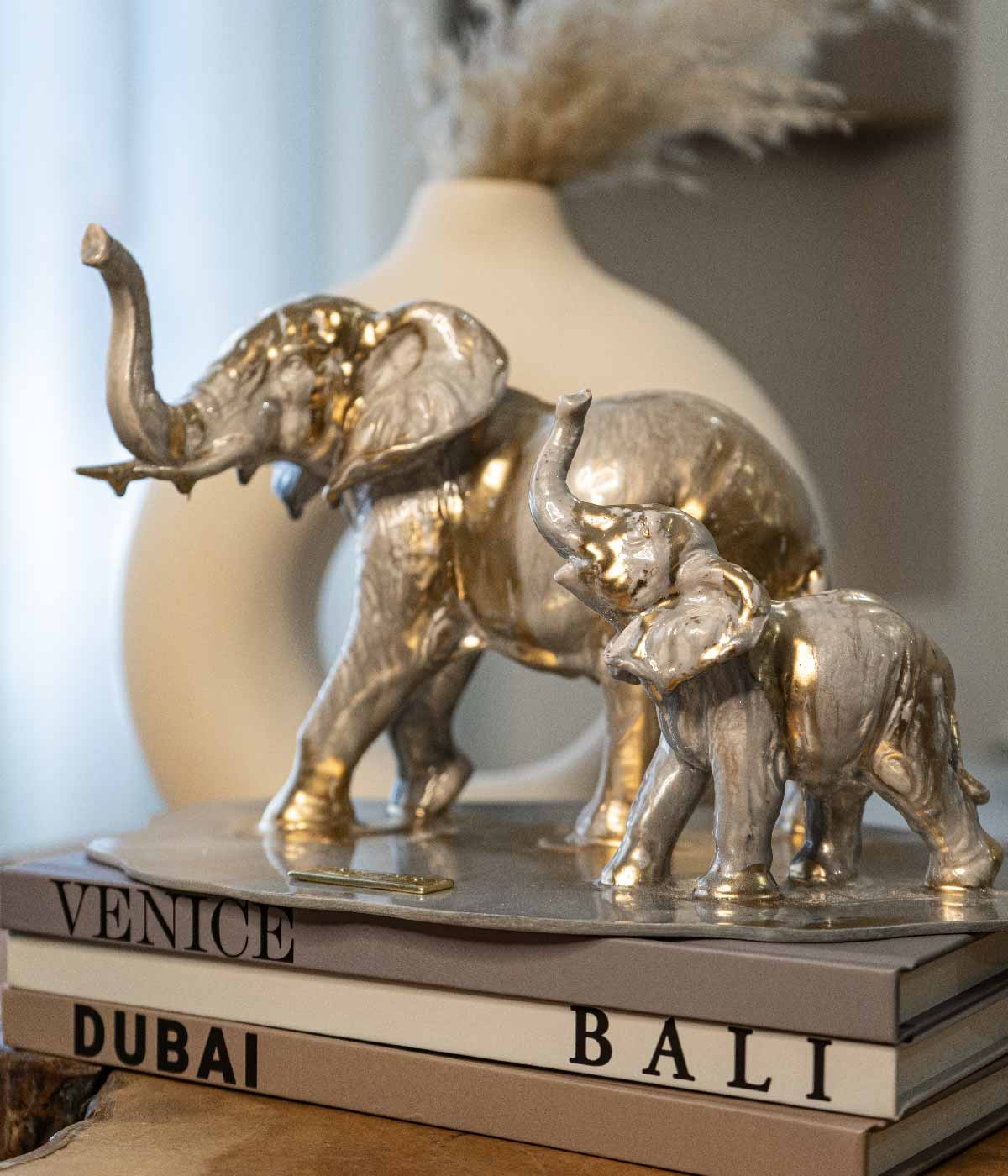 Añade un toque de sofisticación a tu espacio con esta elegante escultura de elefantes en resina. Con detalles finos que capturan la majestuosidad de estos animales, esta pieza combina durabilidad y ligereza. Ideal para cualquier estilo decorativo, aporta una sensación de calma y elegancia a tu hogar.
