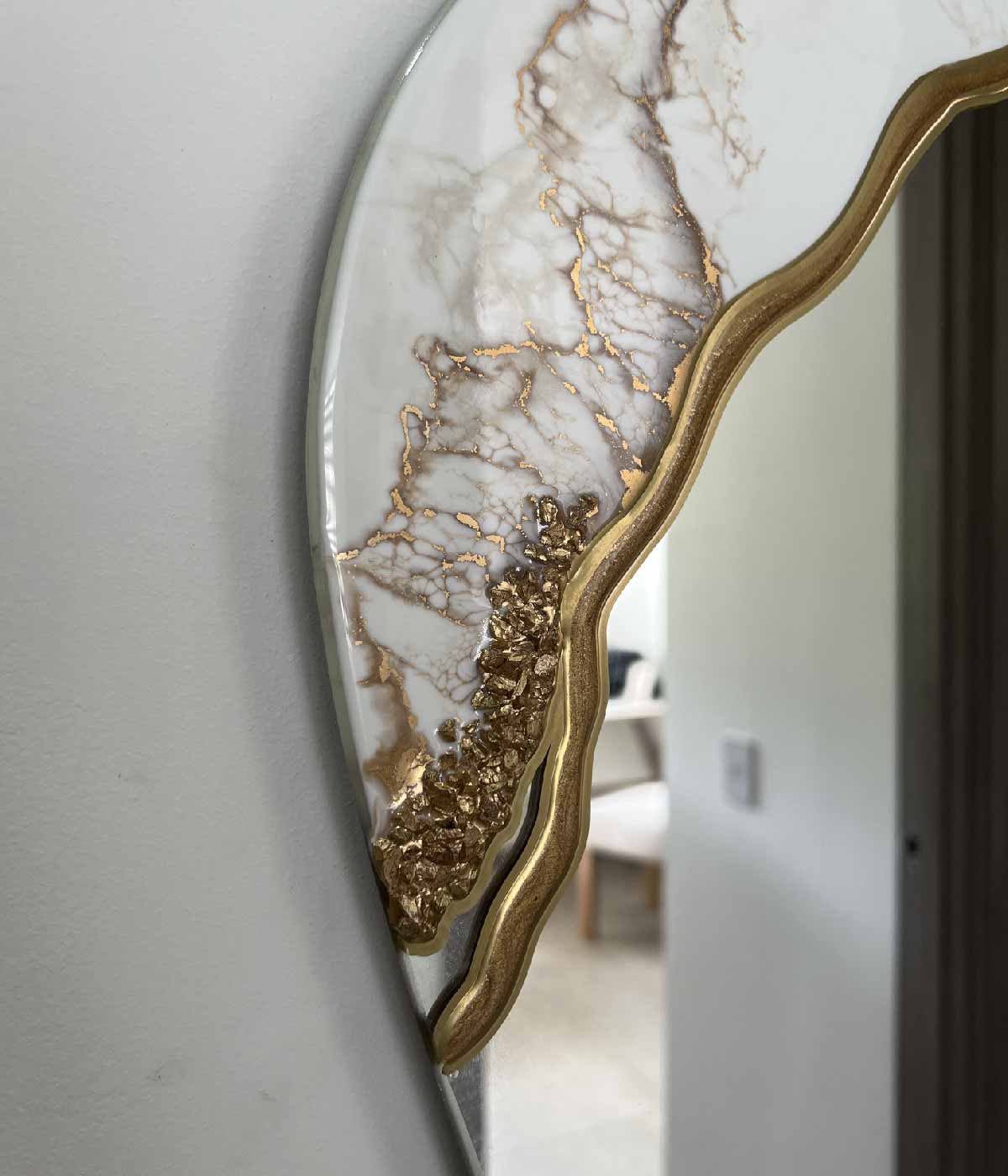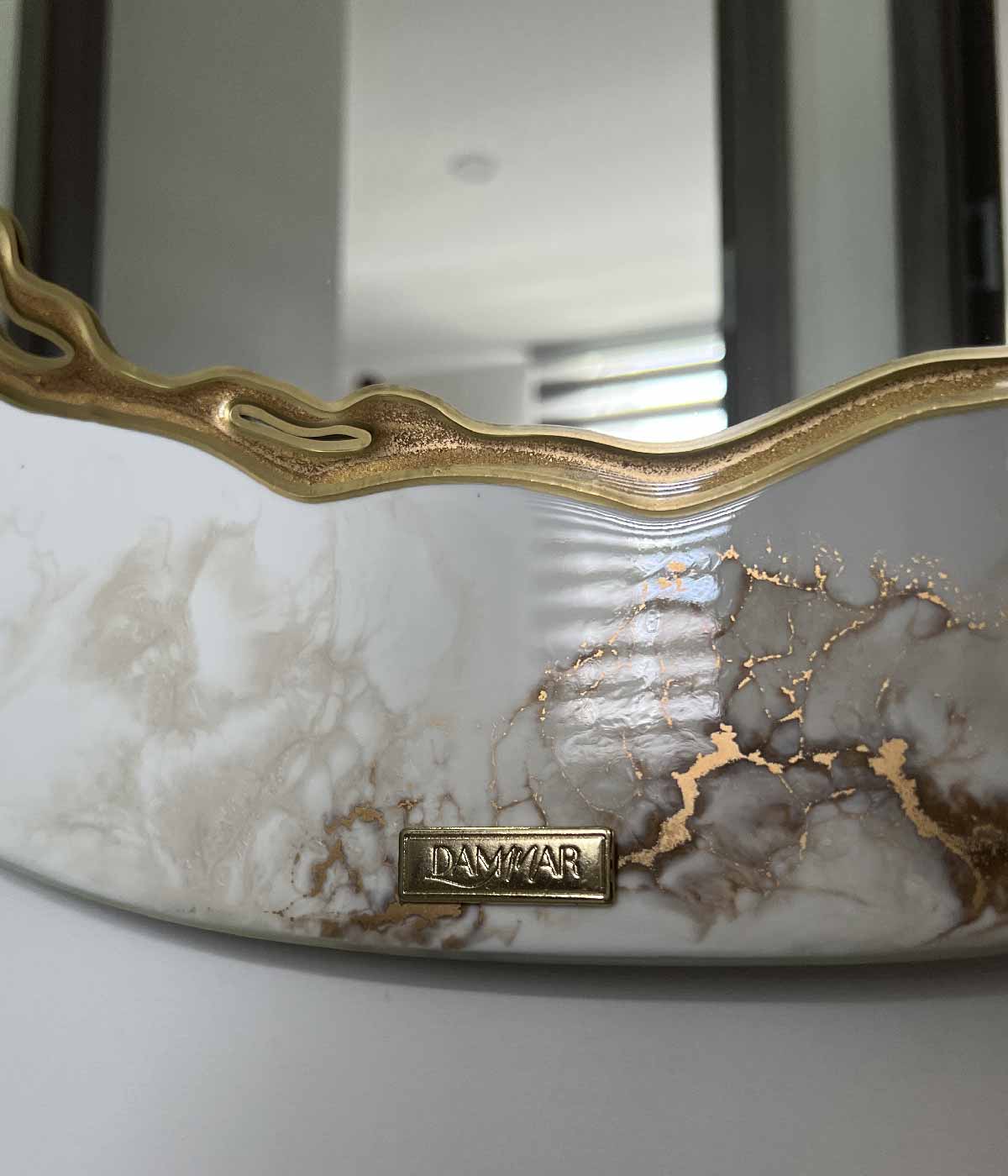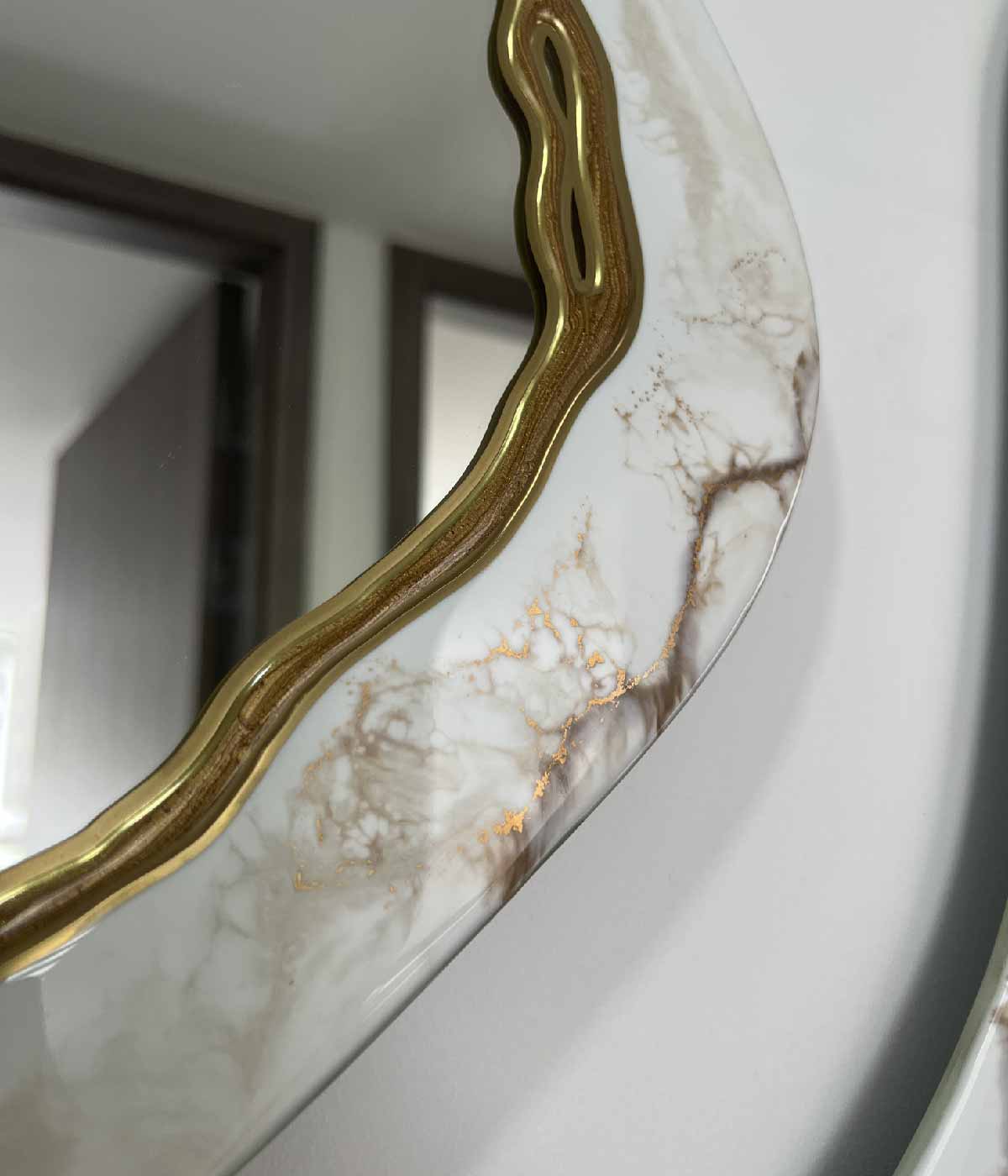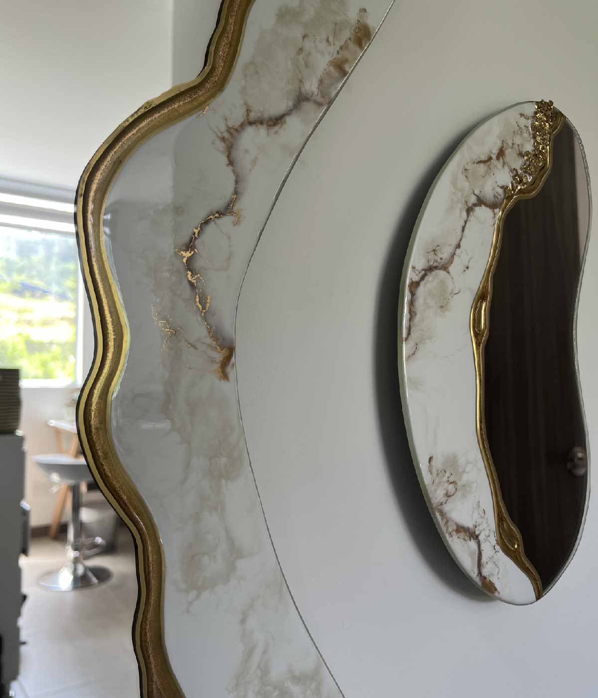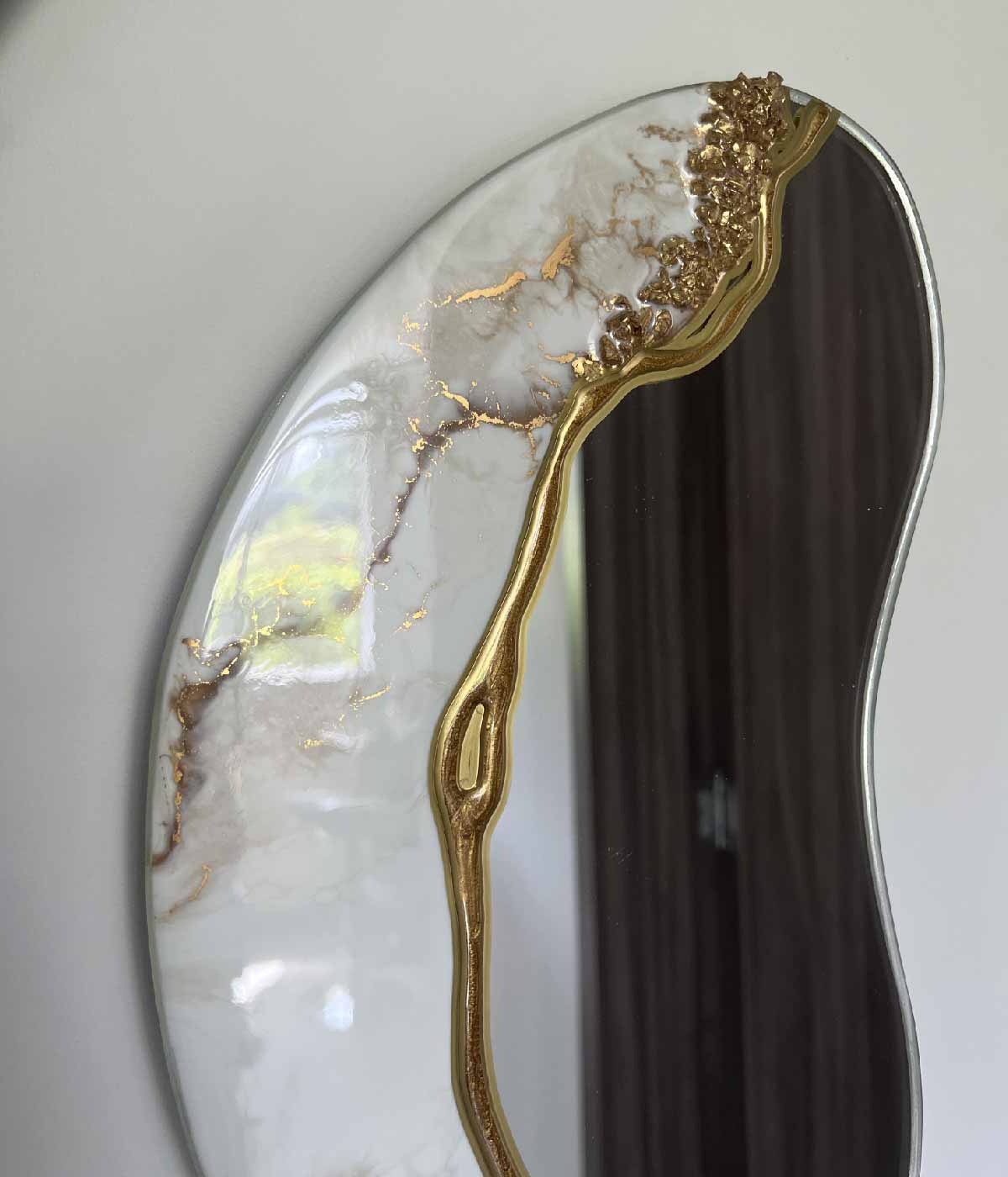 Hermoso espejo irregular de pared perfecto para complementar tus espacios en colores nácar, blanco, dorado y lineas en relieve.