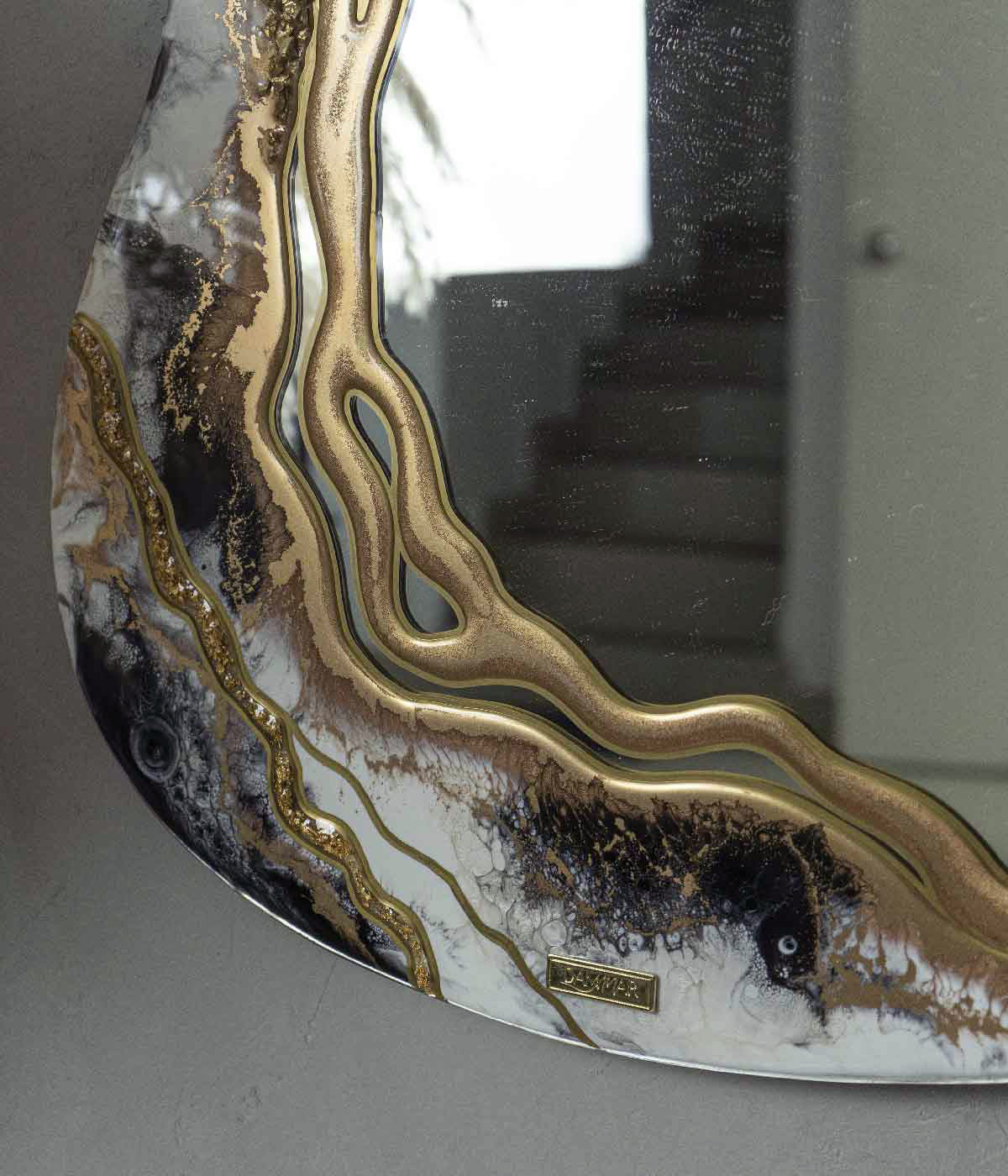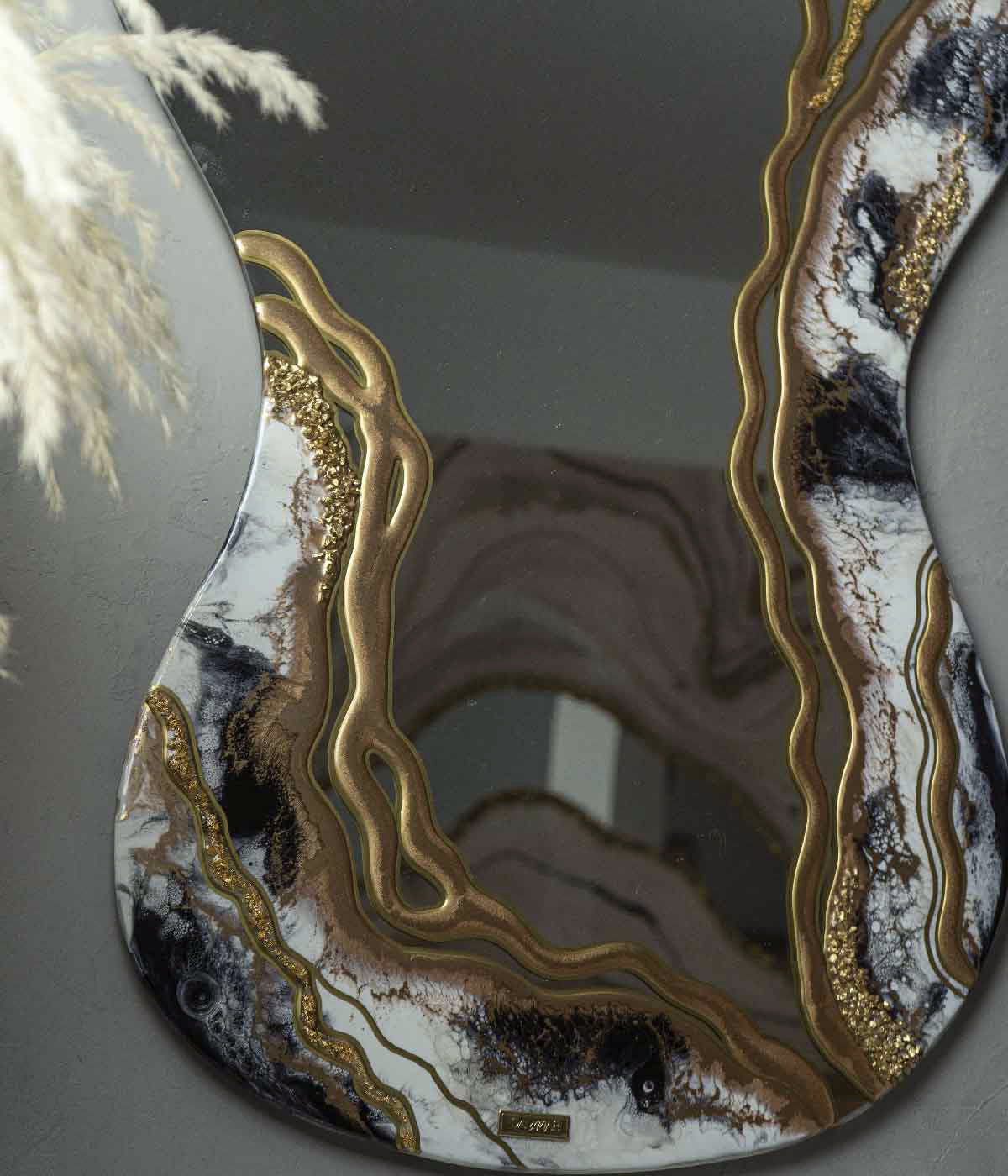 Hermoso espejo irregular de pared perfecto para complementar tus espacios en colores blanco, negro, dorado y lineas en relieve.