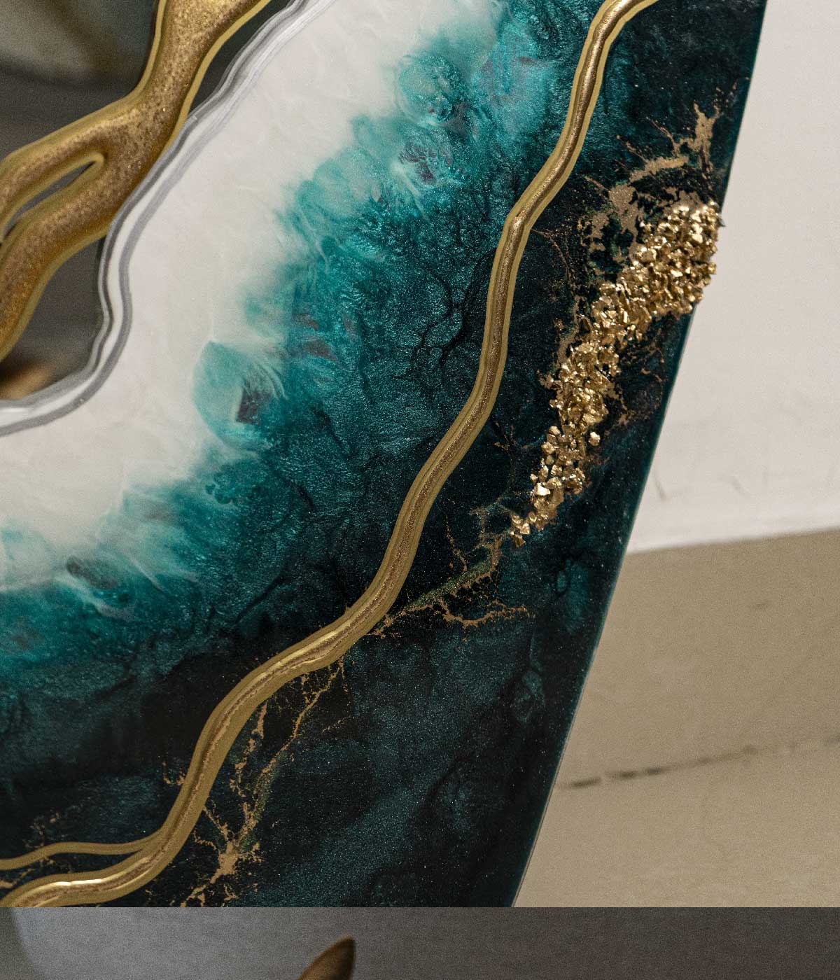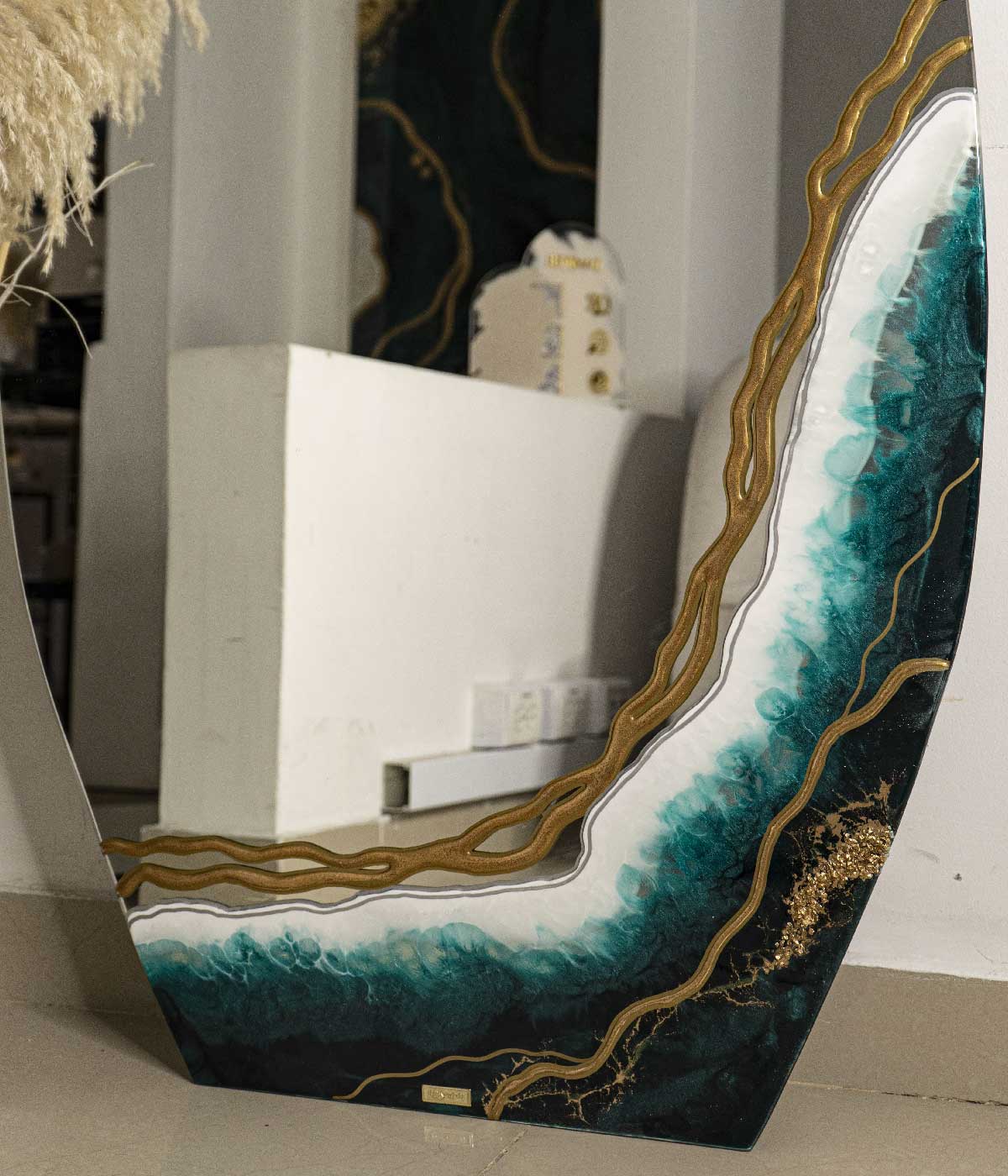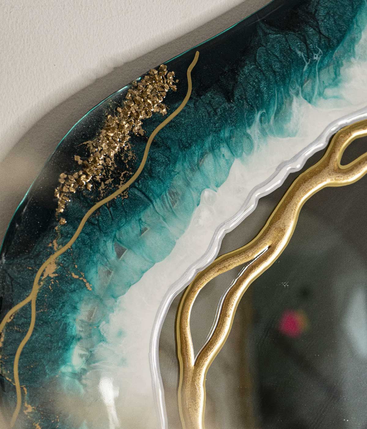 Hermoso espejo irregular de pared perfecto para complementar tus espacios en colores blanco, esmeralda, dorado y lineas en relieve.