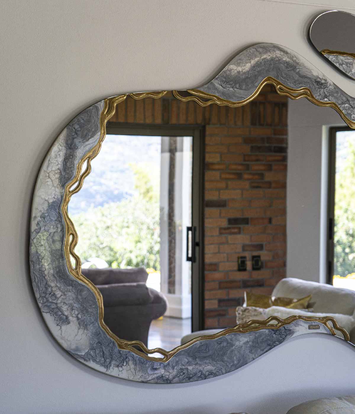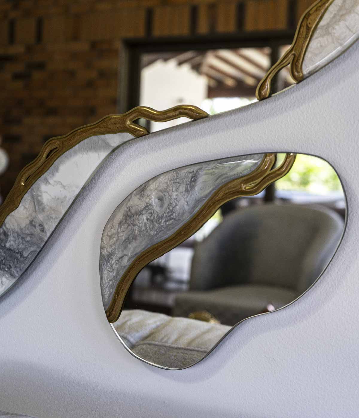 Hermoso espejo irregular de pared perfecto para complementar tus espacios en colores café, nácar, blanco, dorado y lineas en relieve.