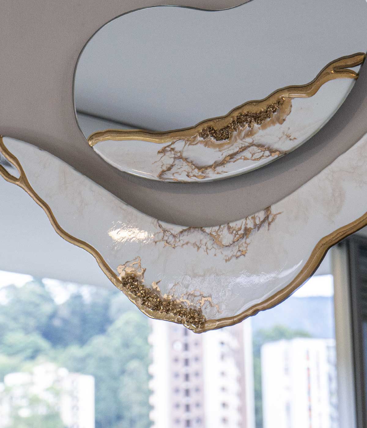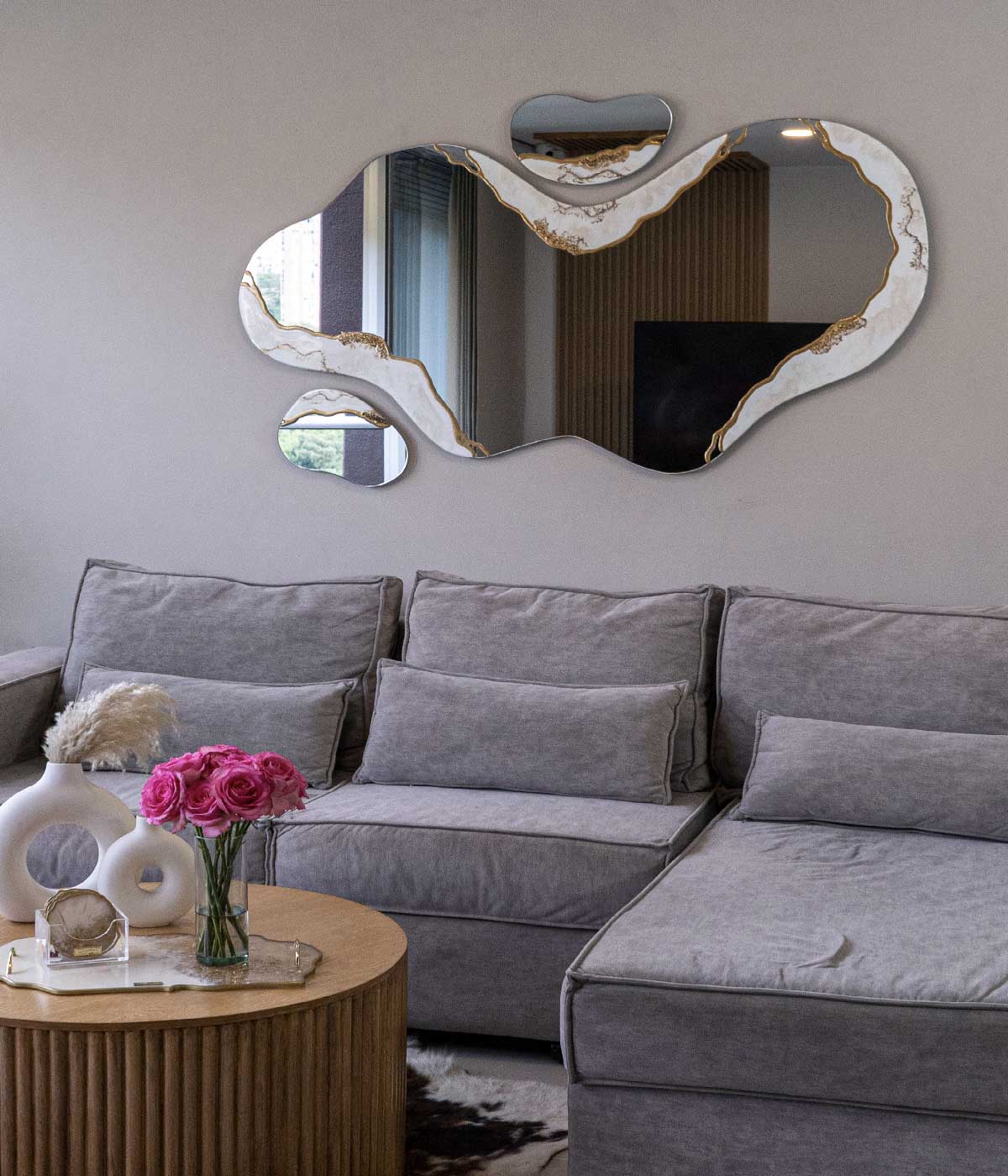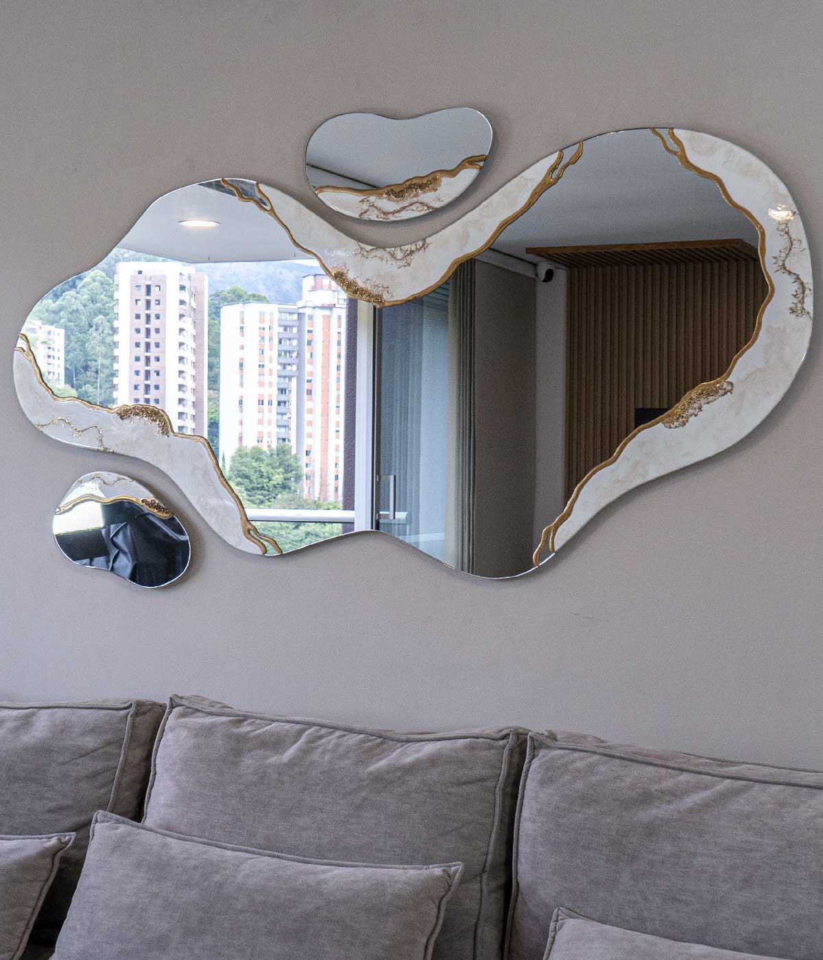 Hermoso espejo irregular de pared perfecto para complementar tus espacios en colores nácar, blanco, dorado y lineas en relieve.
