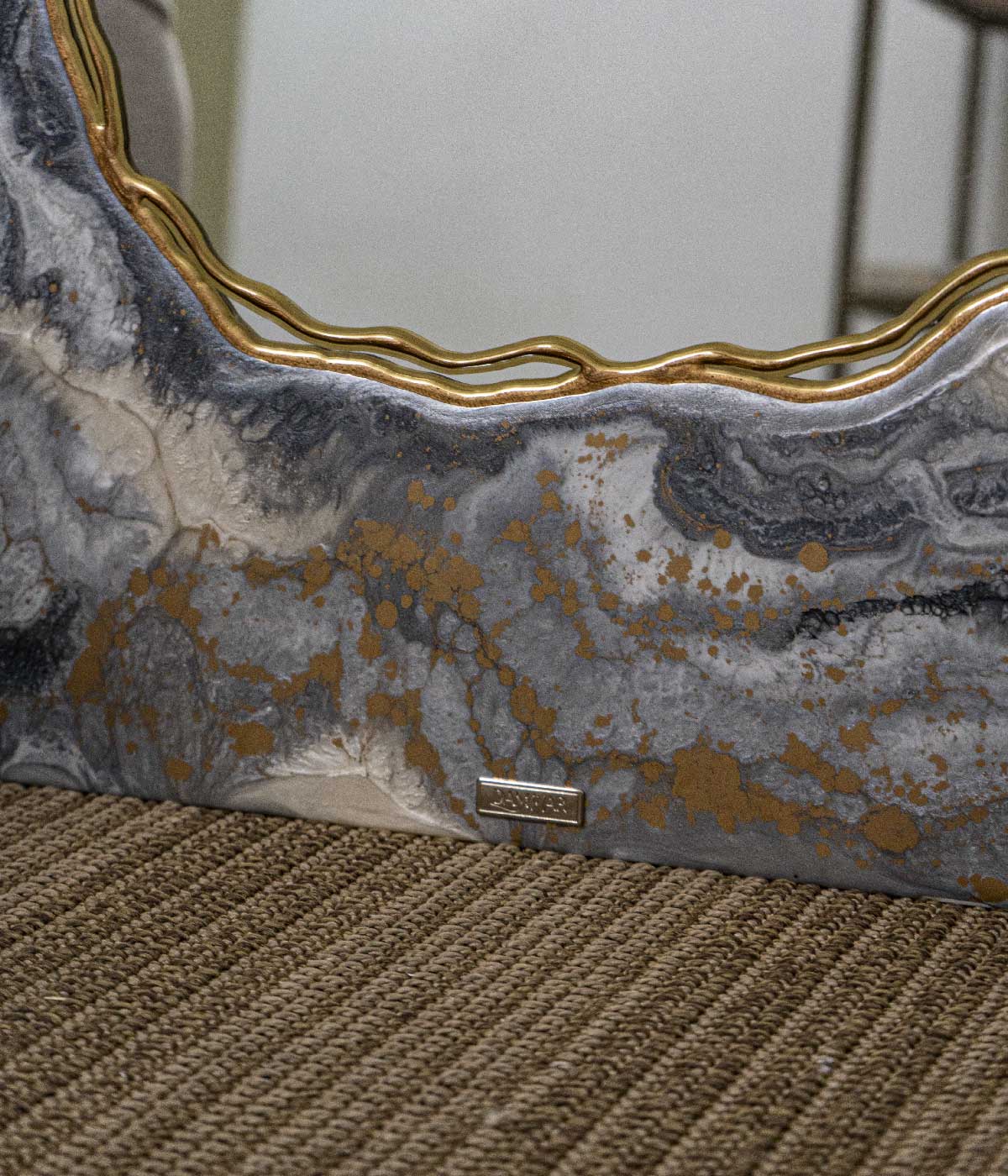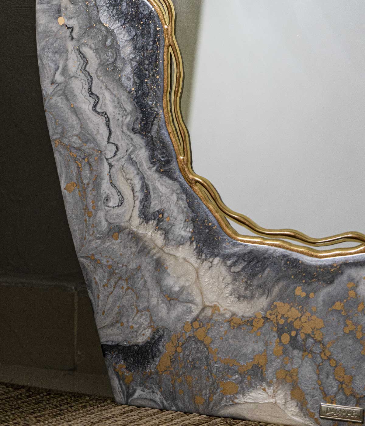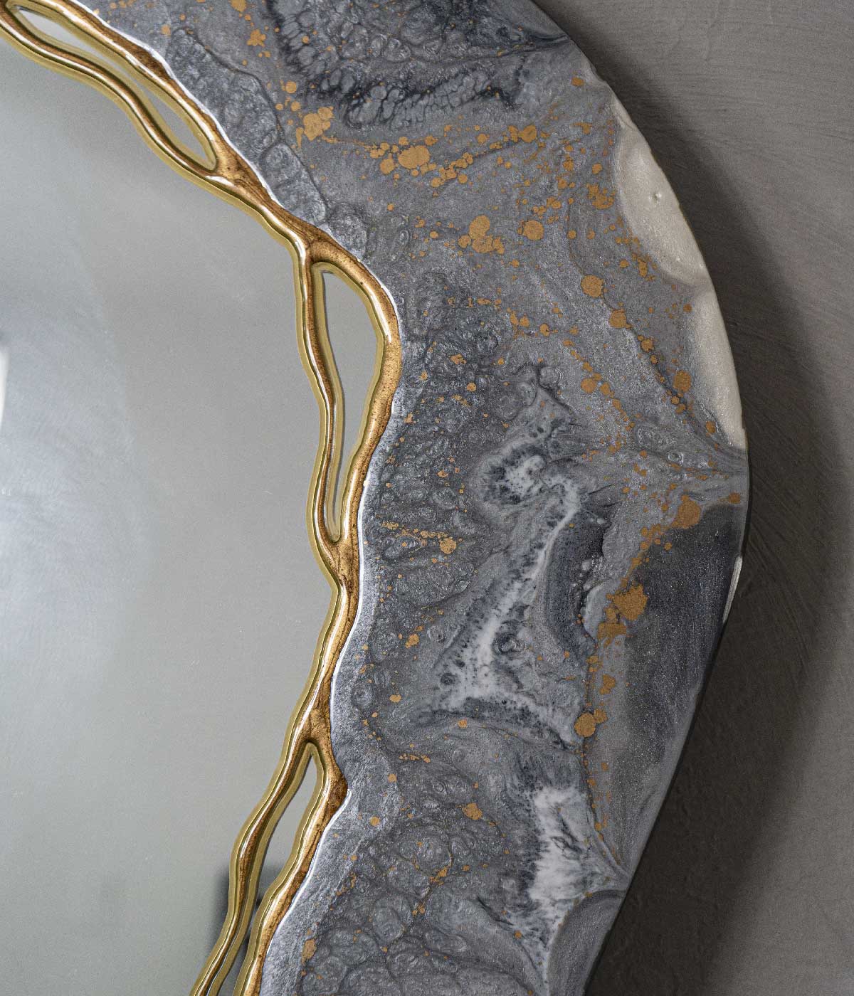 Hermoso espejo irregular de pared perfecto para complementar tus espacios en colores gris, nácar, blanco, dorado y líneas en relieve doradas.