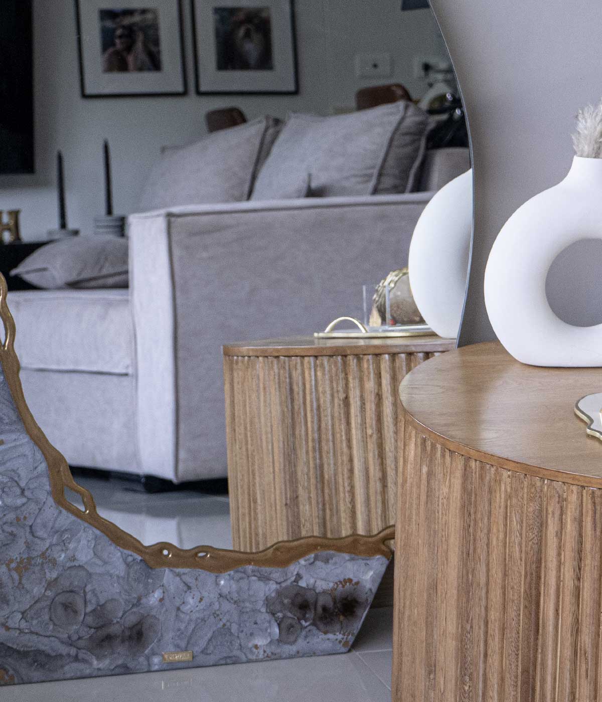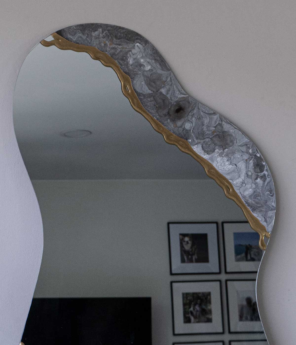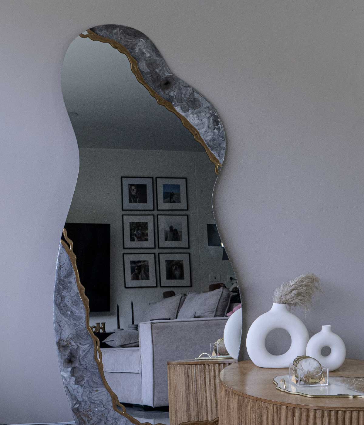 Hermoso espejo irregular de pared perfecto para complementar tus espacios en colores gris, nácar, blanco, dorado y líneas en relieve doradas.
