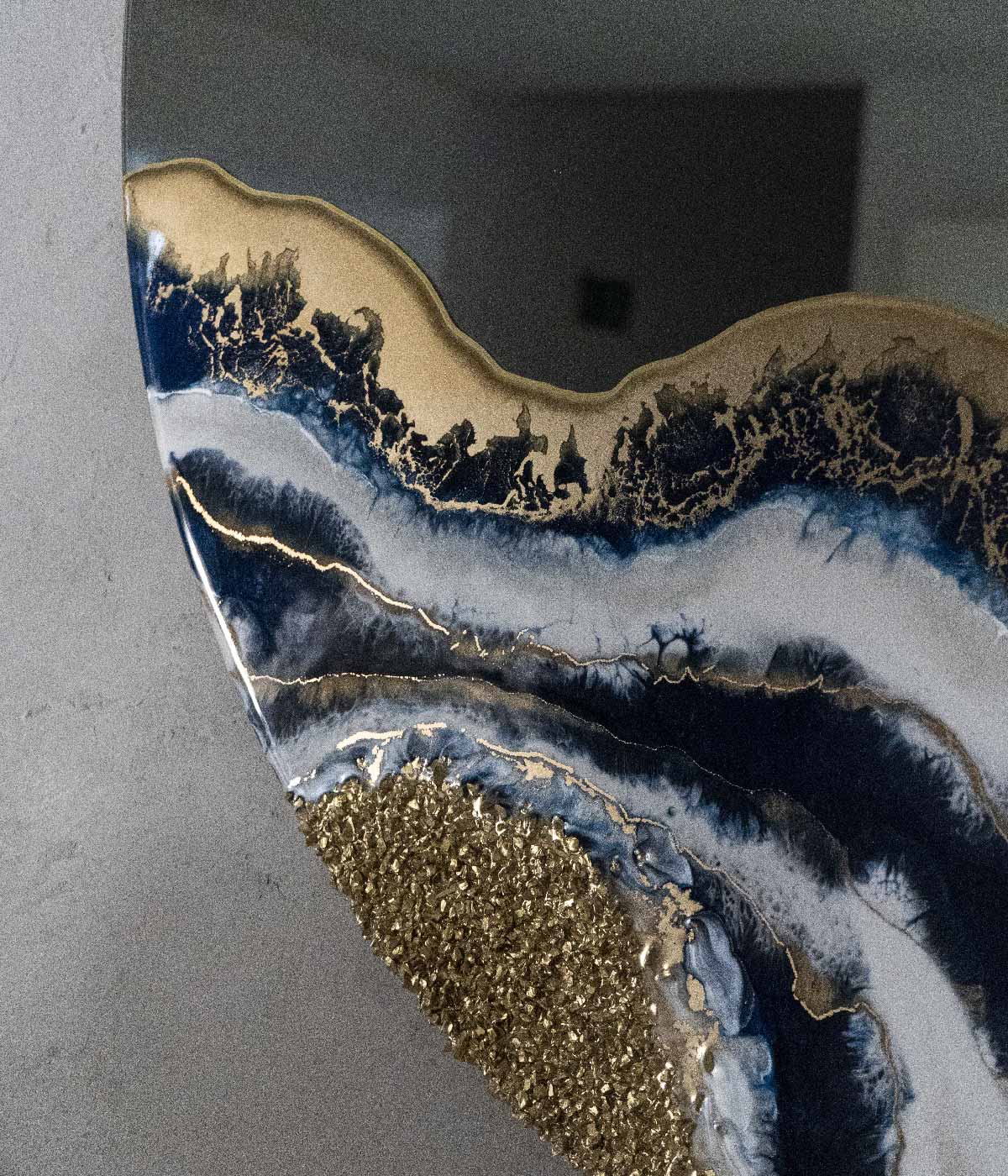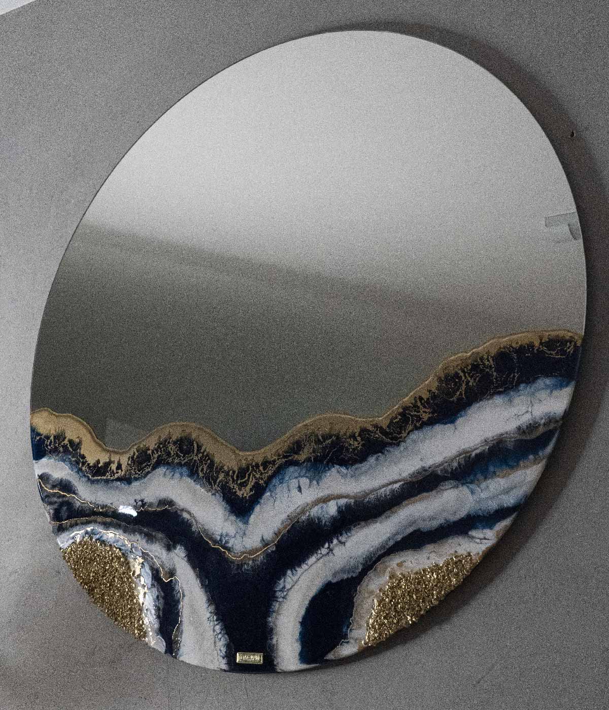 Hermoso espejo circular de pared perfecto para complementar tus espacios en colores blanco, azul, dorado, con cuarzos y lineas de relieve.