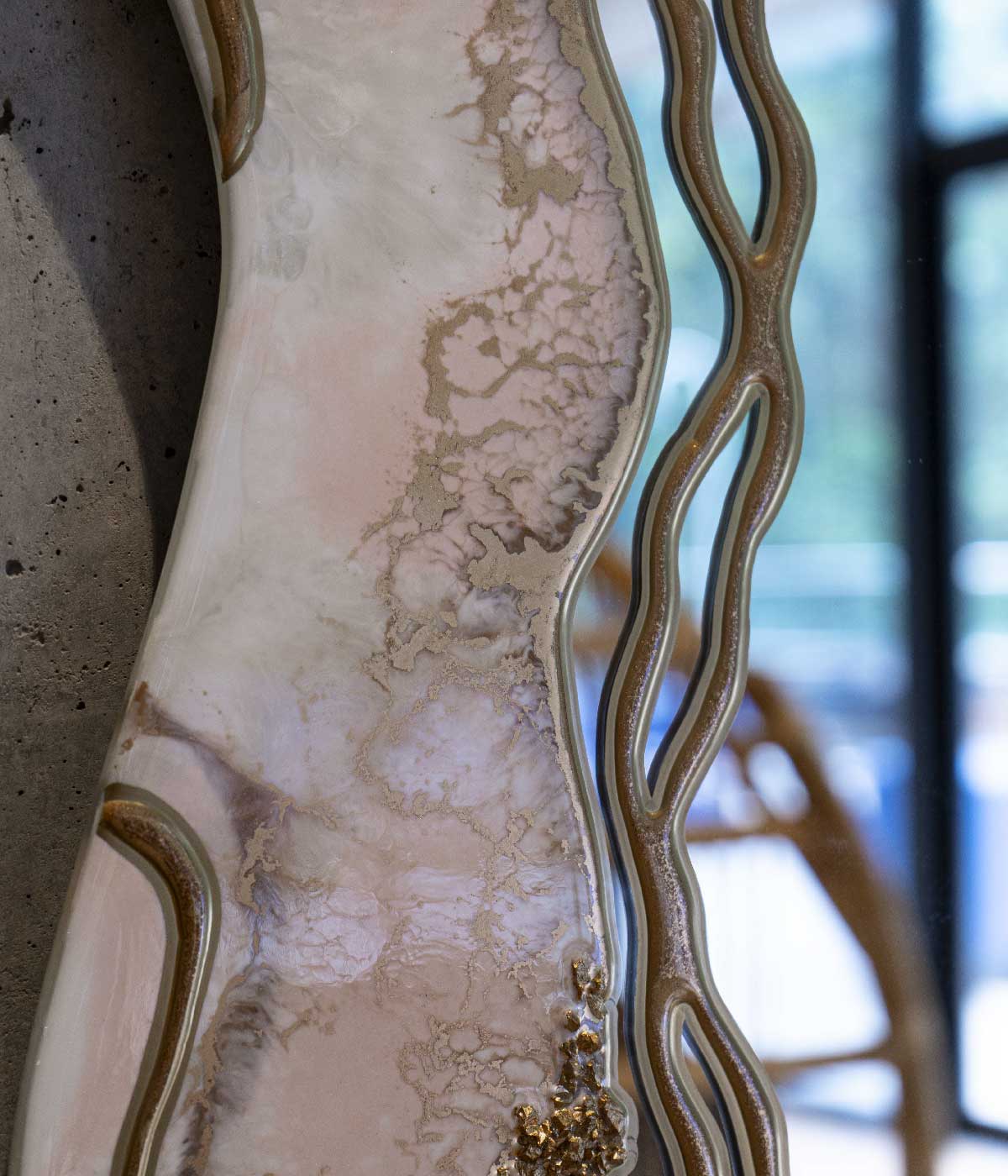 Hermoso espejo irregular de pared perfecto para complementar tus espacios en colores blanco, nácar, dorado y lineas en relieve.