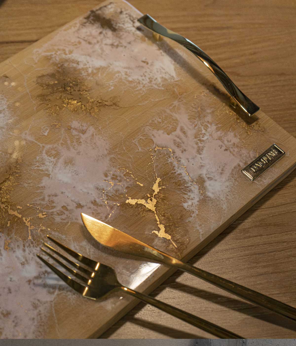 Hermosa bandeja para servir en forma rectangular con base de bambú y cubrimiento en resina.