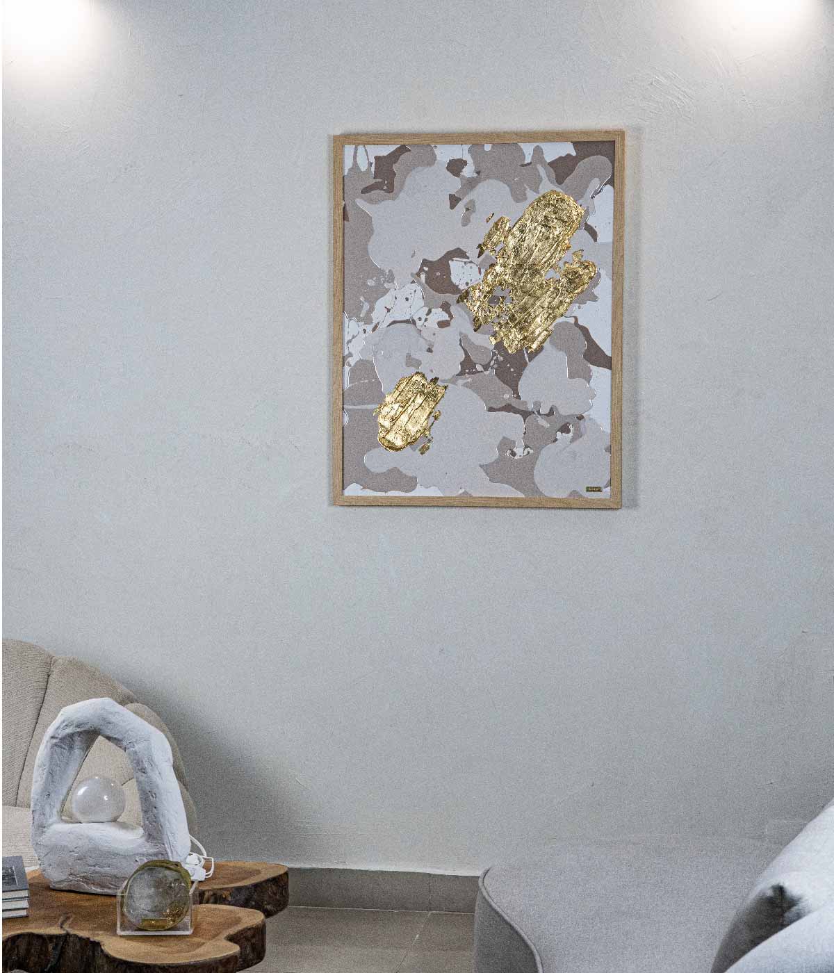 Este cuadro de alta calidad está hecho de resina con toques en laminilla de oro 24k, lo que lo hace duradero y resistente al paso del tiempo. Su diseño en tonos neutros le da un estilo elegante y versátil que se adaptará a cualquier espacio. Una adición perfecta para tu hogar u oficina.