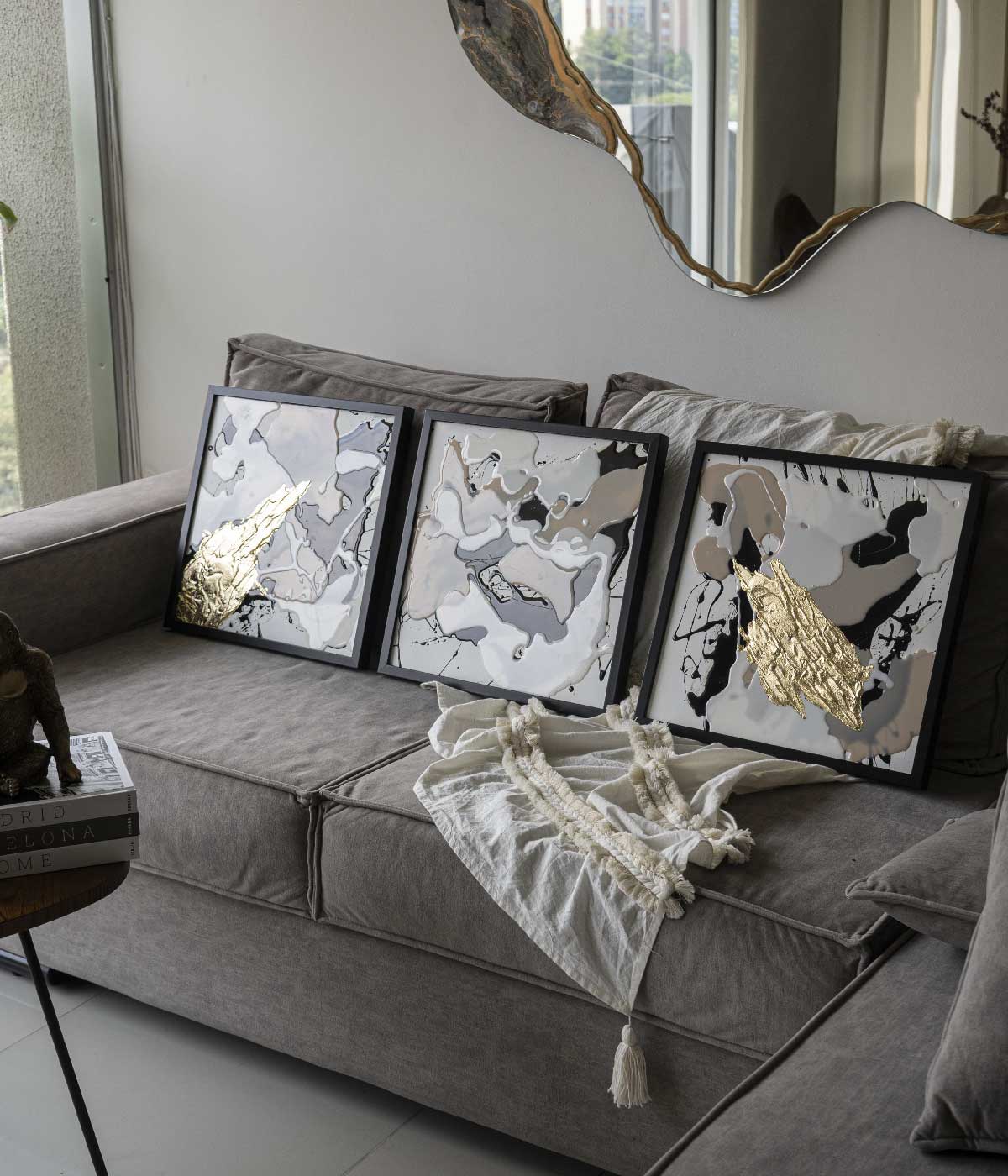 Este cuadro de alta calidad está hecho de resina con toques en laminilla de oro 24k, lo que lo hace duradero y resistente al paso del tiempo. Su diseño en tonos neutros le da un estilo elegante y versátil que se adaptará a cualquier espacio. Una adición perfecta para tu hogar u oficina.