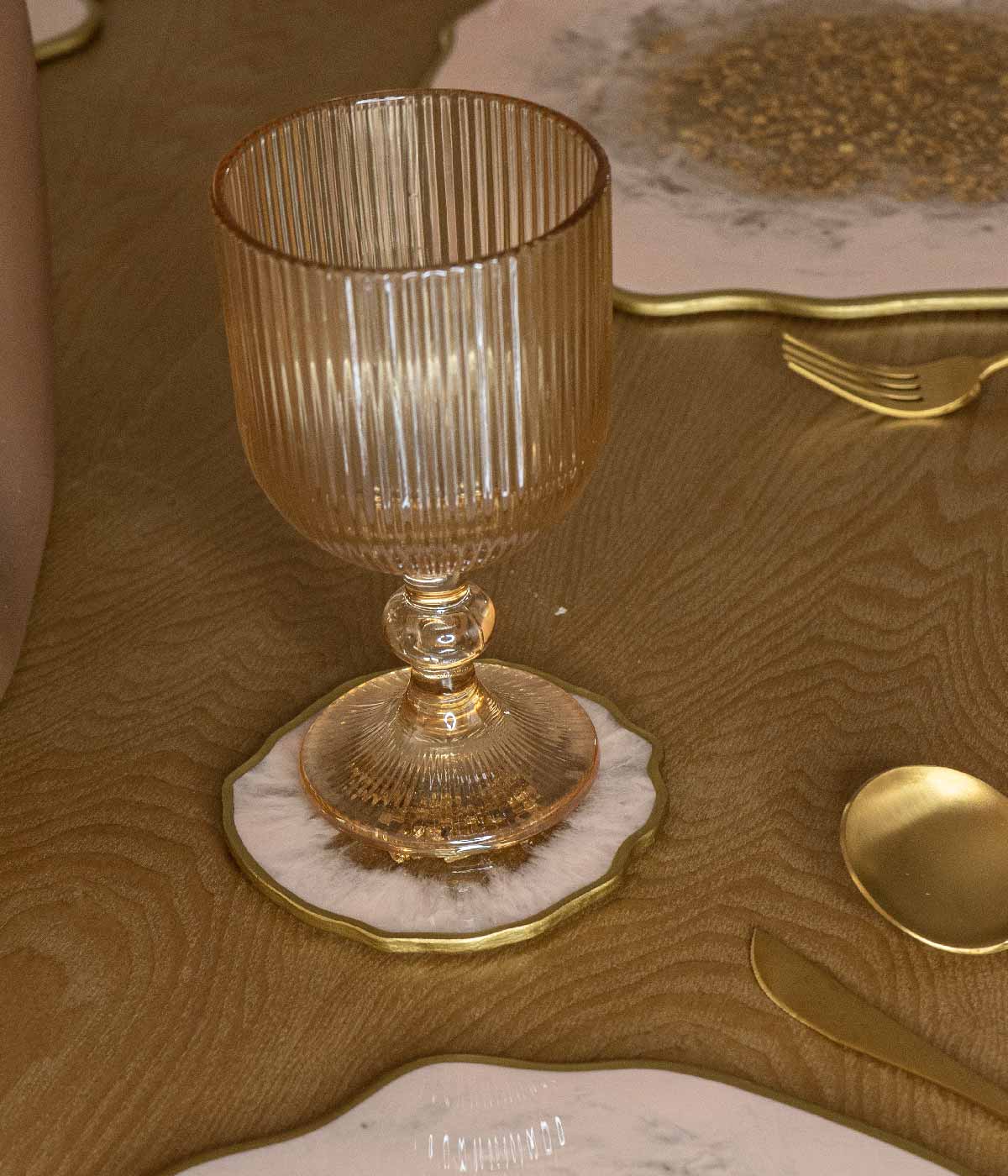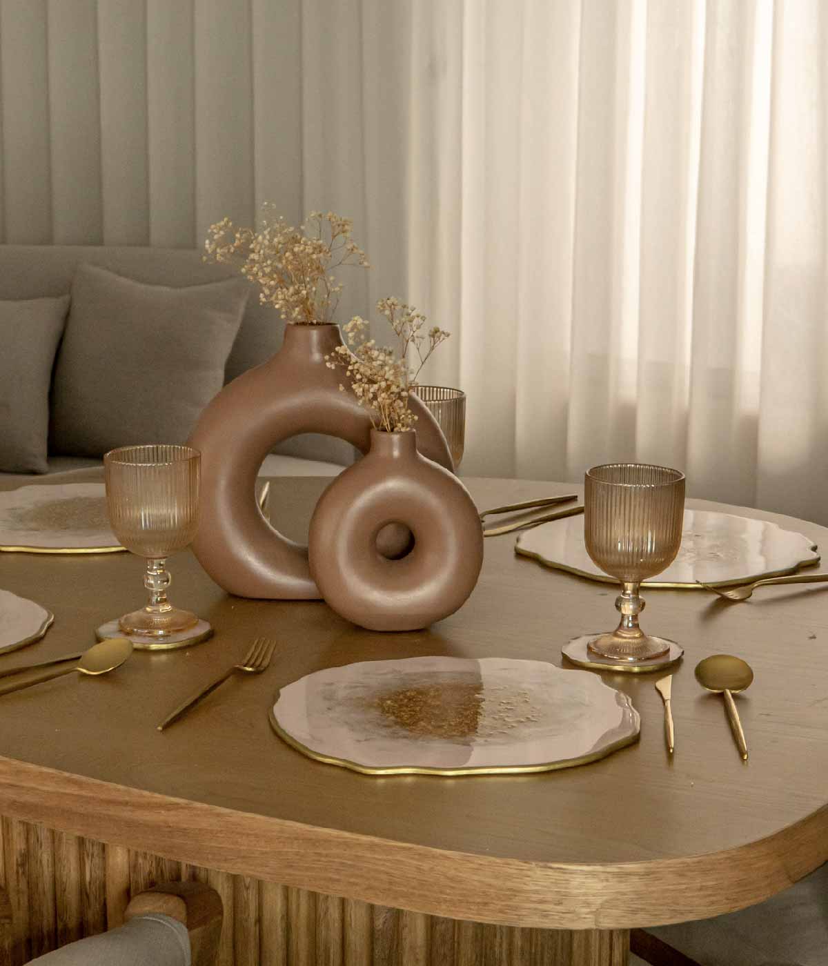 Hermoso set de mesa en forma irregular en color rosa pálido con transparencia en el centro y laminilla oro 24k. Son perfectos para elevar la presentación de cualquier mesa, añadiendo un toque de elegancia y distinción a cada comida. Con una textura suave y acabados impecables, estos individuales no solo protegen tu mesa, sino que también aportan un estilo sofisticado y atemporal.