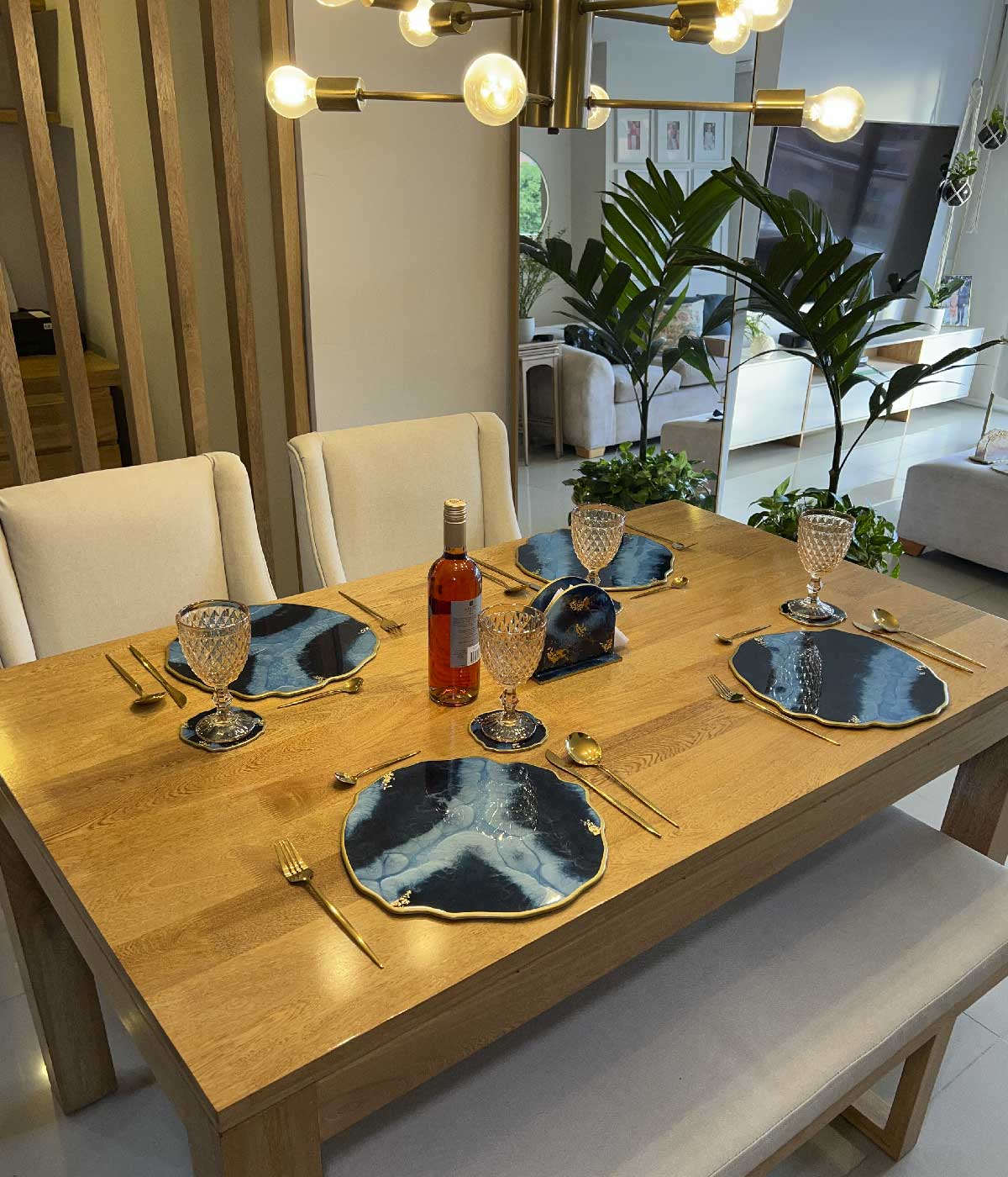 Hermoso set de mesa en forma irregular en colores azules con toques de laminilla oro 24k. es una elección perfecta si deseas tener un ambiente elegante y natural al mismo tiempo. Combina la belleza de las flores con la durabilidad y facilidad de mantenimiento de la resina, creando así un conjunto de individuales único y encantador.