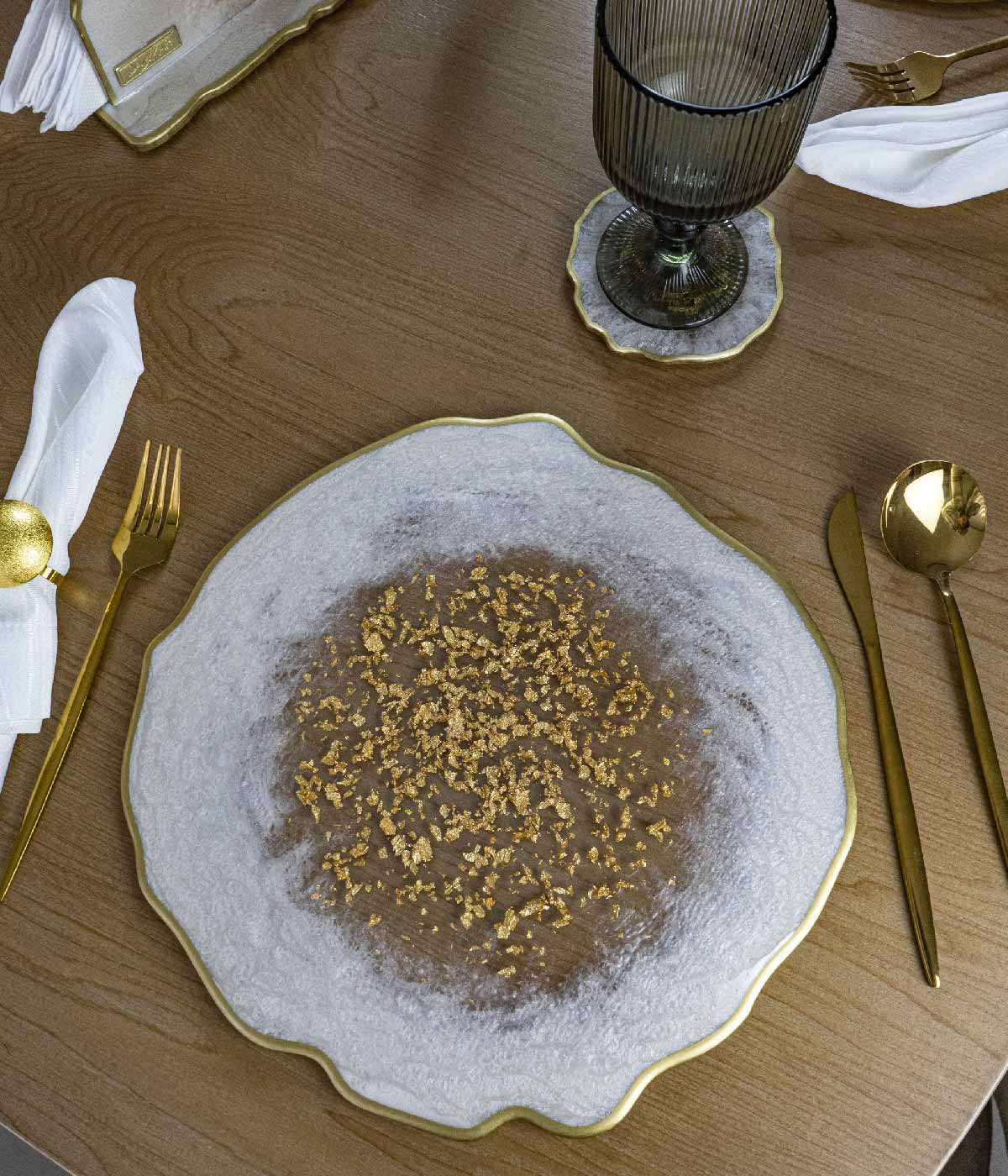✨ Elegancia y resistencia en tu mesa ✨ Hermoso set de mesa en forma irregular en color nácar con transparencia en el centro y laminilla plateada. Son perfectos para elevar la presentación de cualquier mesa, añadiendo un toque de elegancia y distinción a cada comida. Con una textura suave y acabados impecables, estos individuales no solo protegen tu mesa, sino que también aportan un estilo sofisticado y atemporal.
