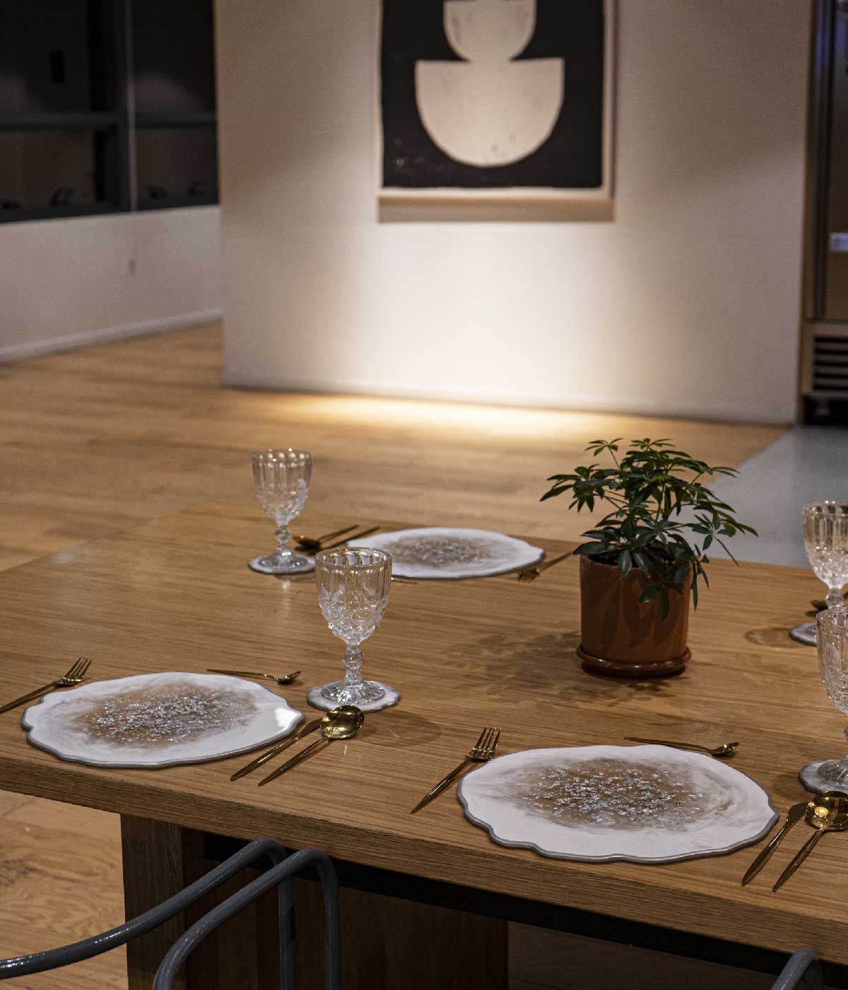 Hermoso set de mesa en forma irregular en color blanco con transparencia en el centro y laminilla plateada. una elección perfecta si deseas tener un ambiente elegante y natural al mismo tiempo. Combina la belleza de las flores con la durabilidad y facilidad de mantenimiento de la resina, creando así un conjunto de individuales único y encantador.