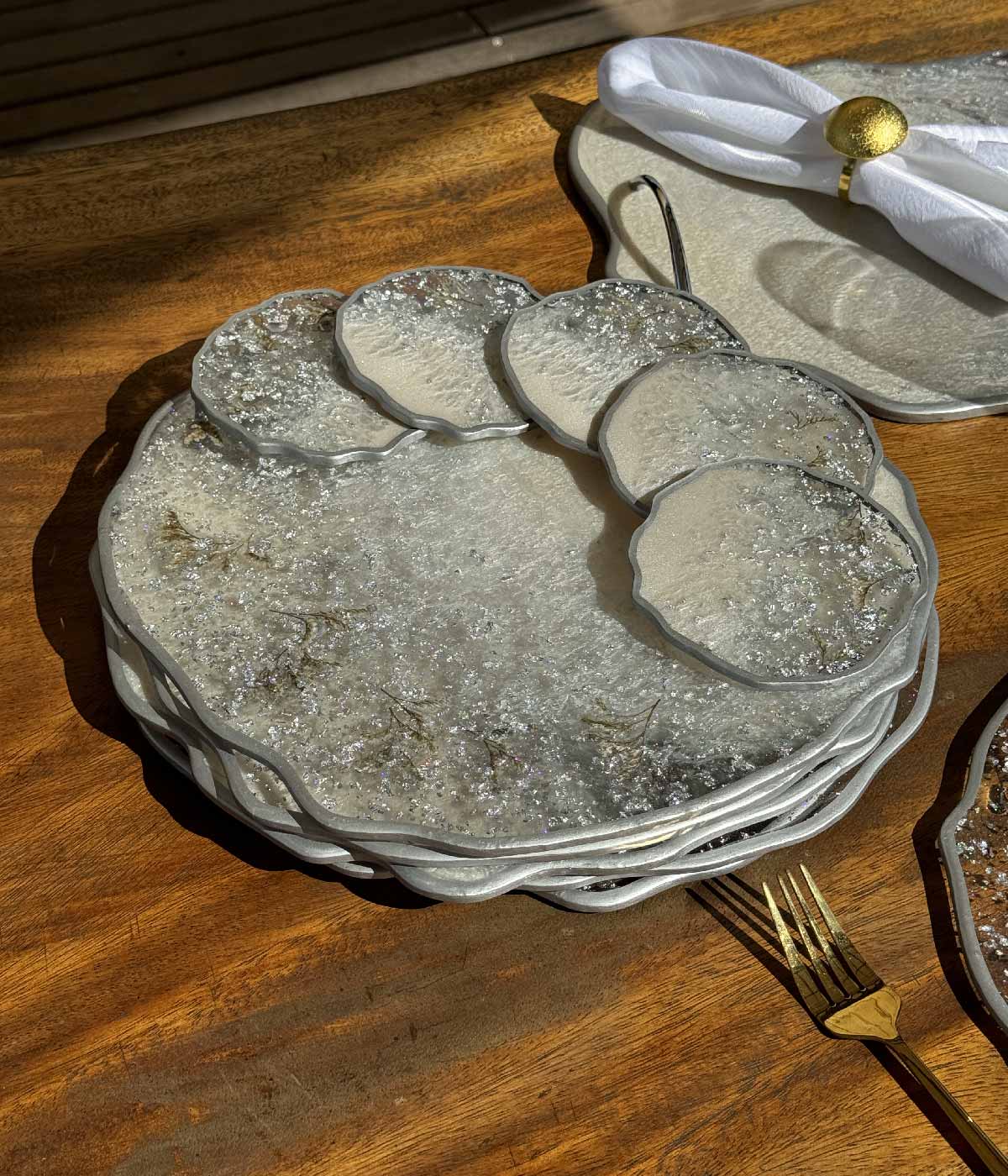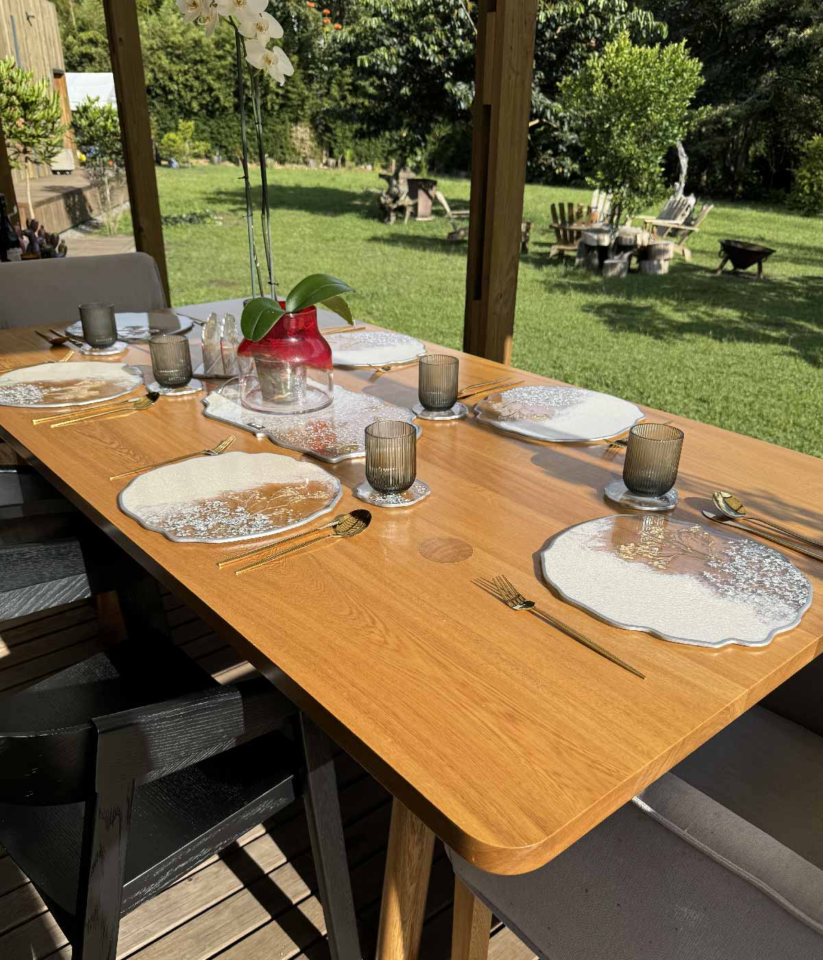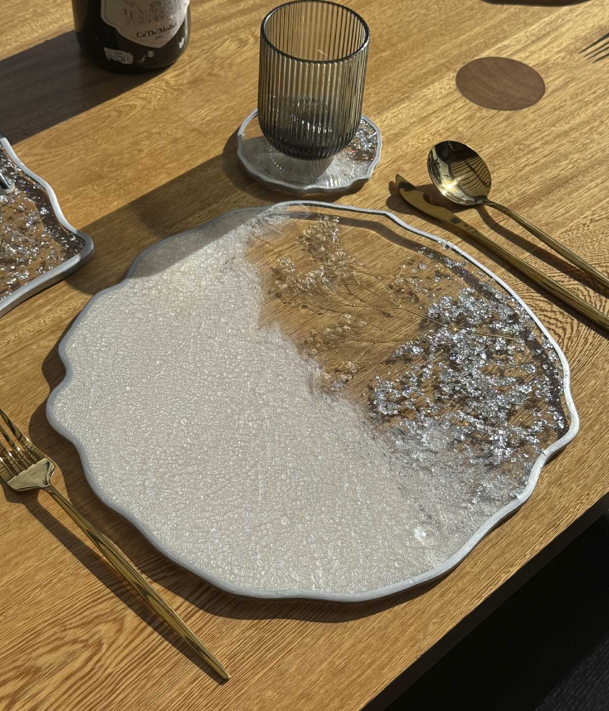 Nuestro juego de mesa en resina y flor natural es una elección perfecta si deseas tener un ambiente elegante y natural al mismo tiempo. Combina la belleza de las flores con la durabilidad y facilidad de mantenimiento de la resina, creando así un conjunto de individuos único y encantador.