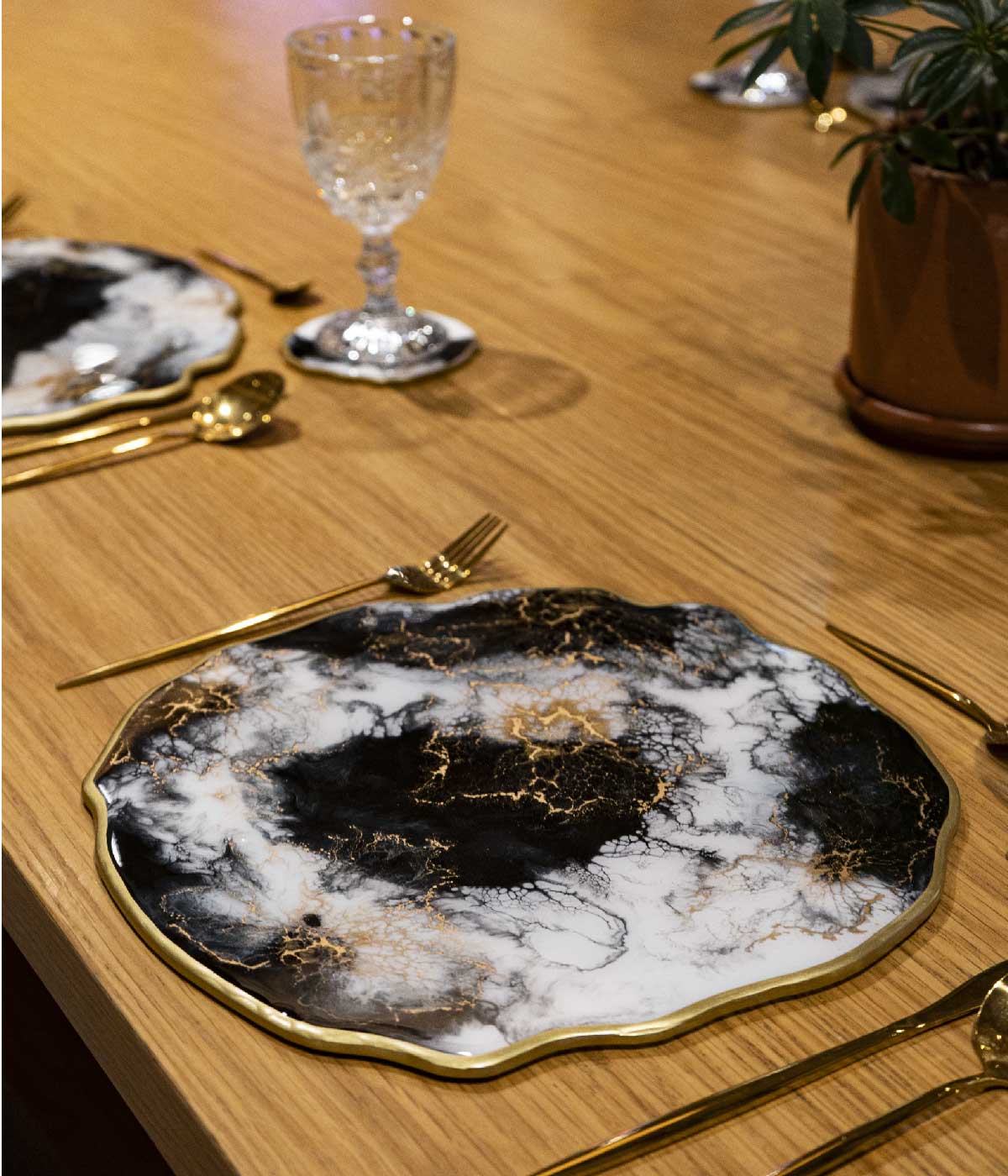 Hermoso set de mesa en forma irregular en color blanco, negro con marmolado dorado. Son perfectos para elevar la presentación de cualquier mesa, añadiendo un toque de elegancia y distinción a cada comida. Con una textura suave y acabados impecables, estos individuales no solo protegen tu mesa, sino que también aportan un estilo sofisticado y atemporal.