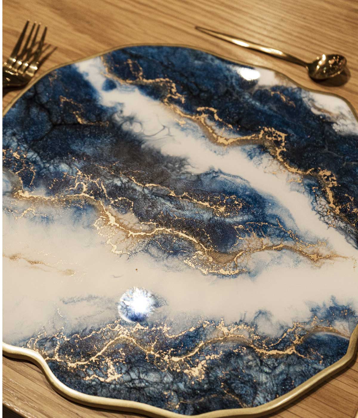 Hermoso set de mesa en forma irregular en azul y blanco con vetas doradas. Incluye platos base y porta vasos. Son perfectos para elevar la presentación de cualquier mesa, añadiendo un toque de elegancia y distinción a cada comida. Con una textura suave y acabados impecables, estos individuales no solo protegen tu mesa, sino que también aportan un estilo sofisticado y atemporal.