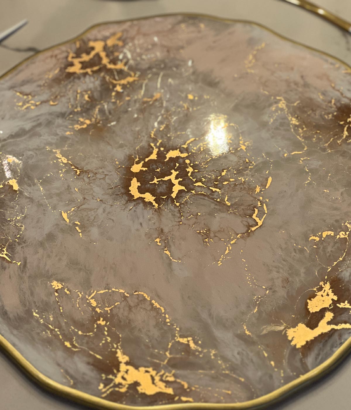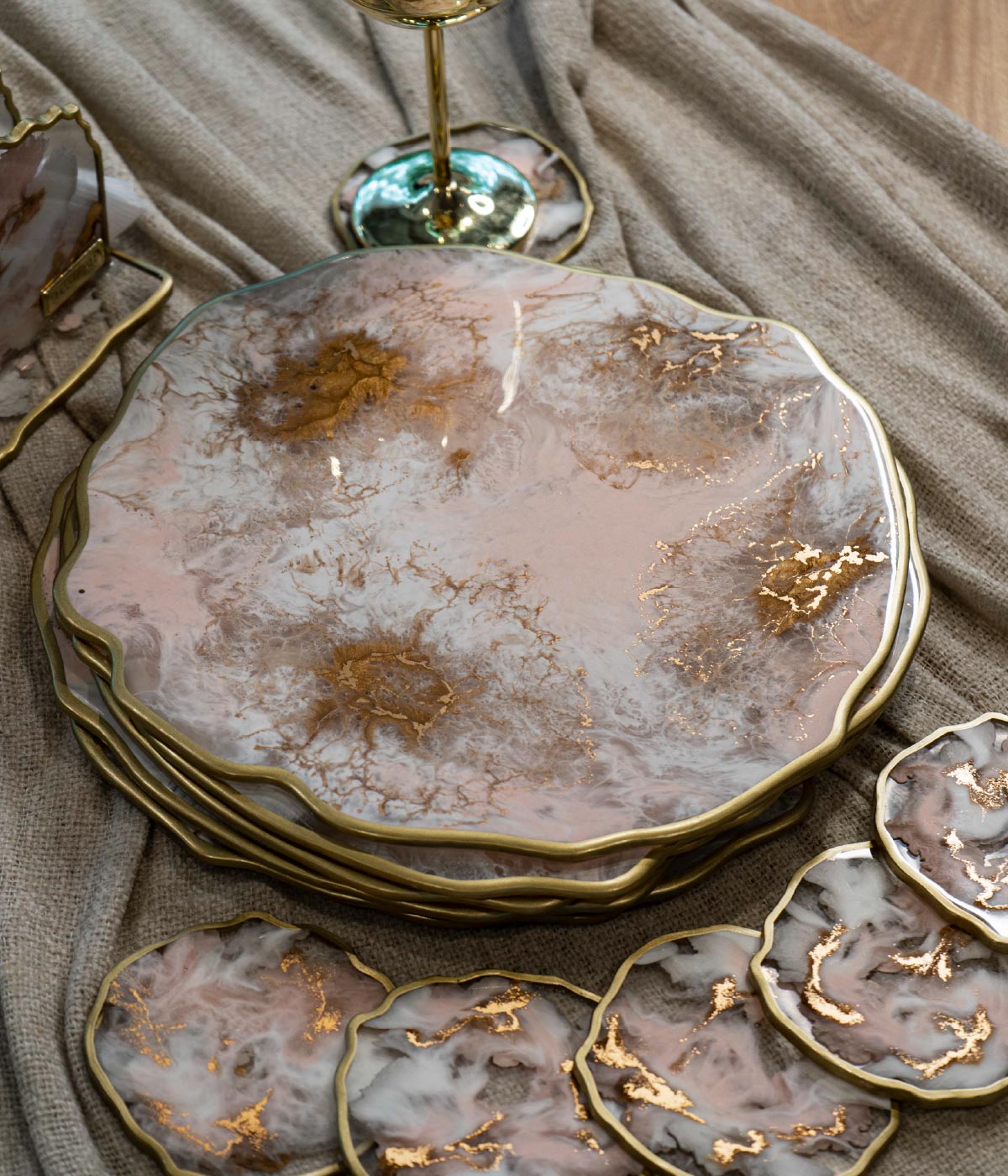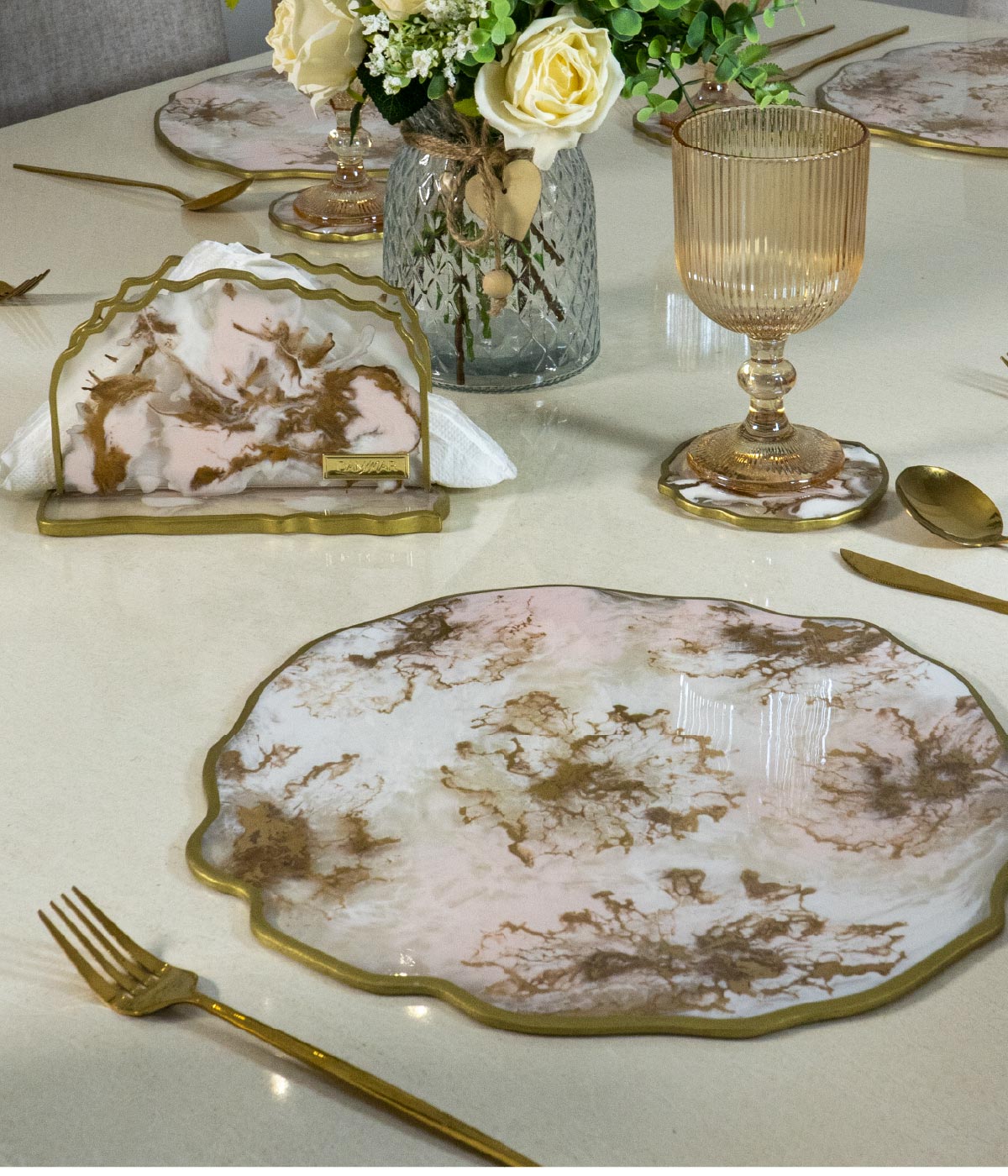 Hermoso set de mesa en forma irregular con base blanco, rosa pálido y transparente con toques de dorado marmolado, este set no solo protege tu mesa sino tambien aporta un estilo único y elegante a tus espacios.