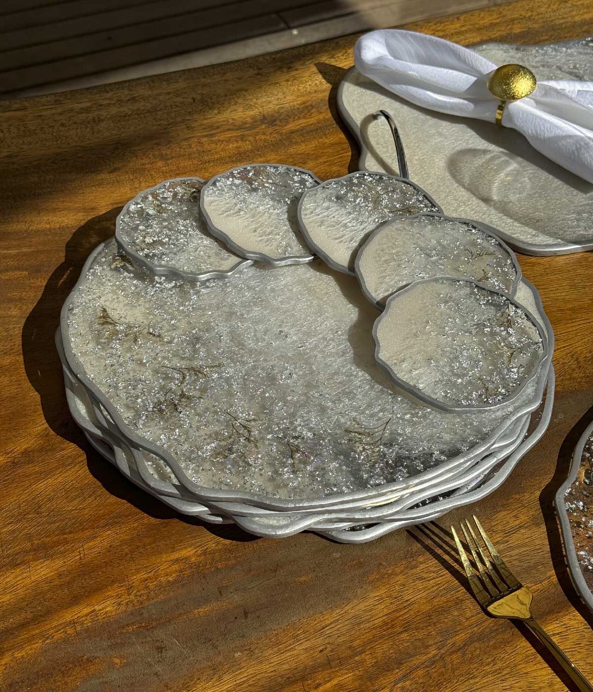 Nuestro set de mesa en resina y flor natural es una elección perfecta si deseas tener un ambiente elegante y natural al mismo tiempo. Combina la belleza de las flores con la durabilidad y facilidad de mantenimiento de la resina, creando así un conjunto de individuales único y encantador.