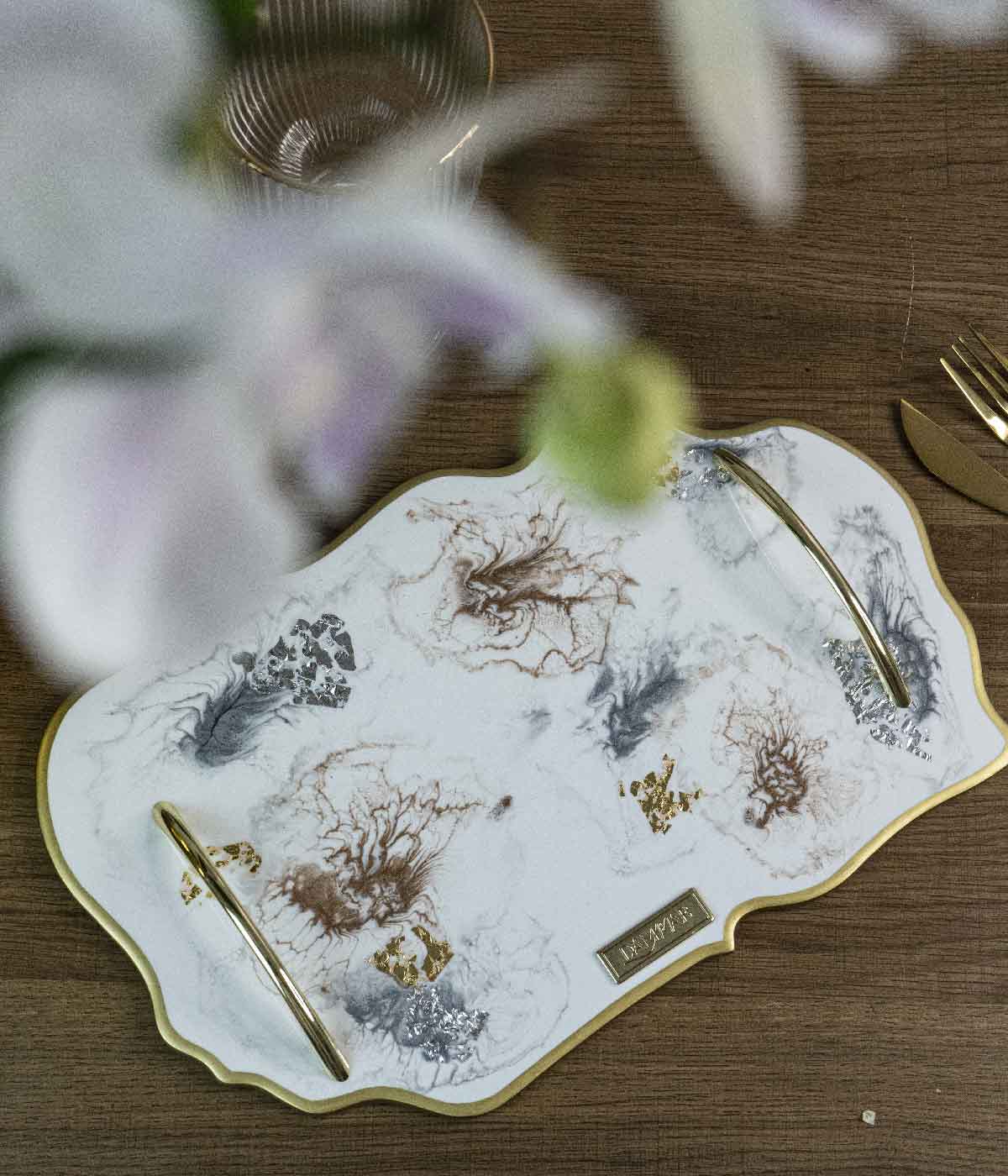Hermosa bandeja, elegante y versátil que te puede servir como porta calientes, bandeja para servir, centro de mesa, estación de café o condimentos en tu cocina, base para tus perfumes y mucho más!