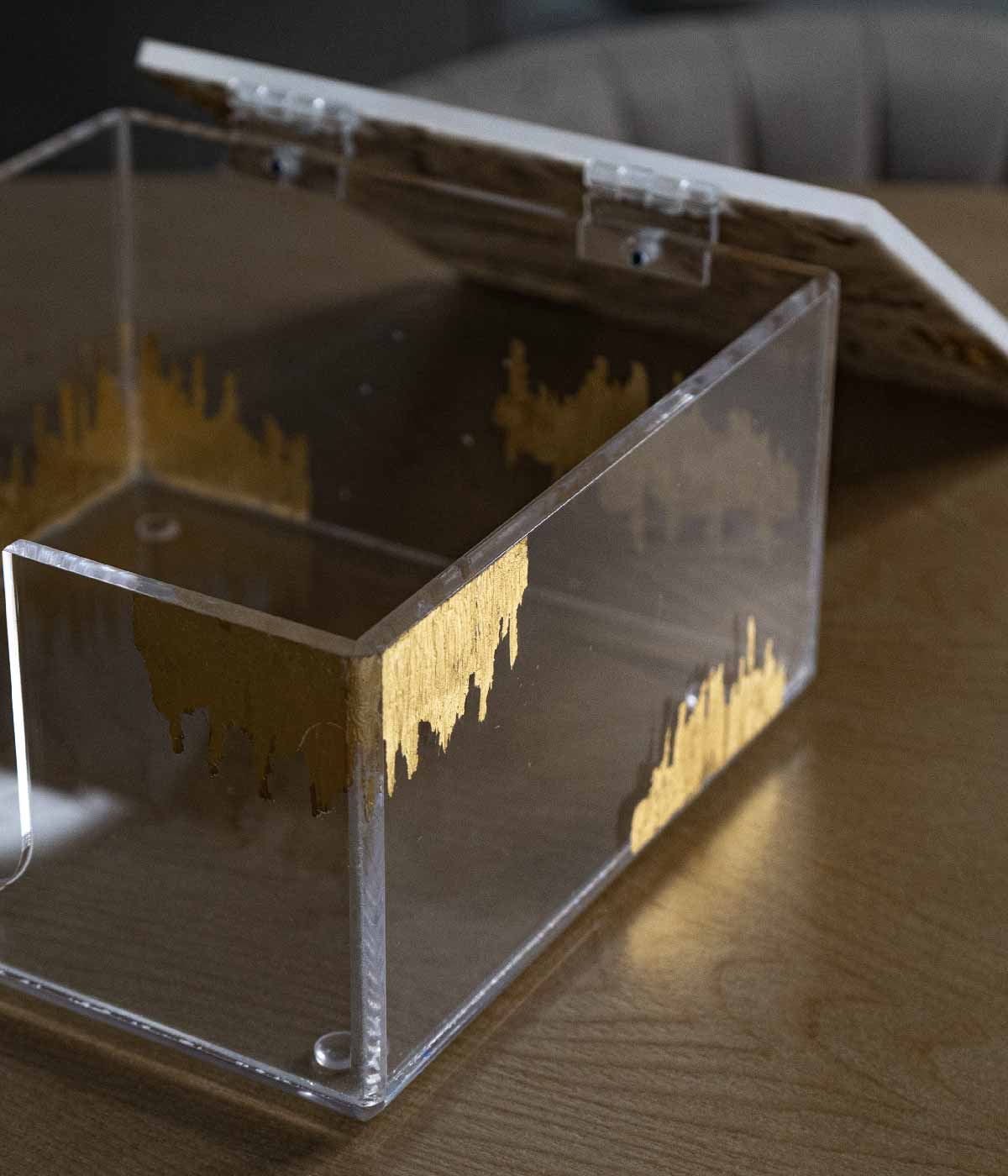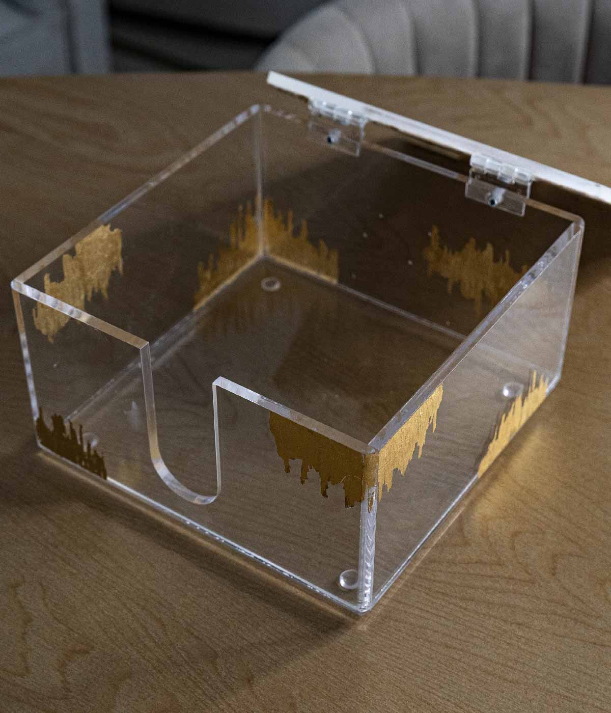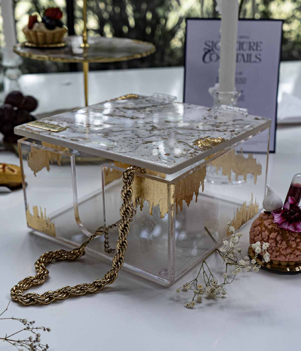 El Cofre Mauna combina lujo y funcionalidad en un diseño minimalista y atemporal. Presentado en tonos blancos y nácar, con sutiles detalles dorados, es el accesorio ideal para añadir un toque de sofisticación a cualquier espacio. Úsalo como servilletero o como organizador en tu baño o cocina, y transforma tus ambientes con una pieza que destaca por su elegancia y versatilidad.