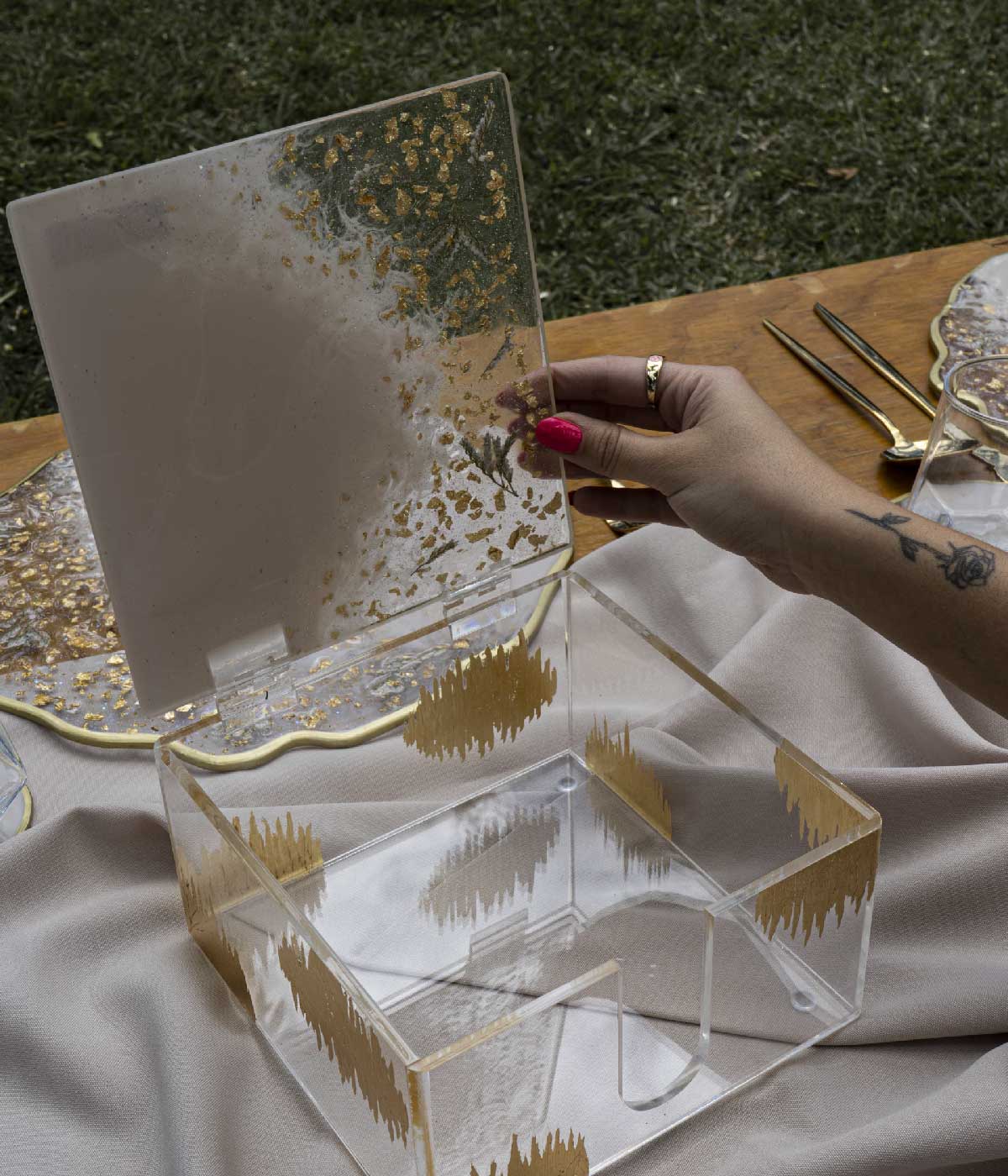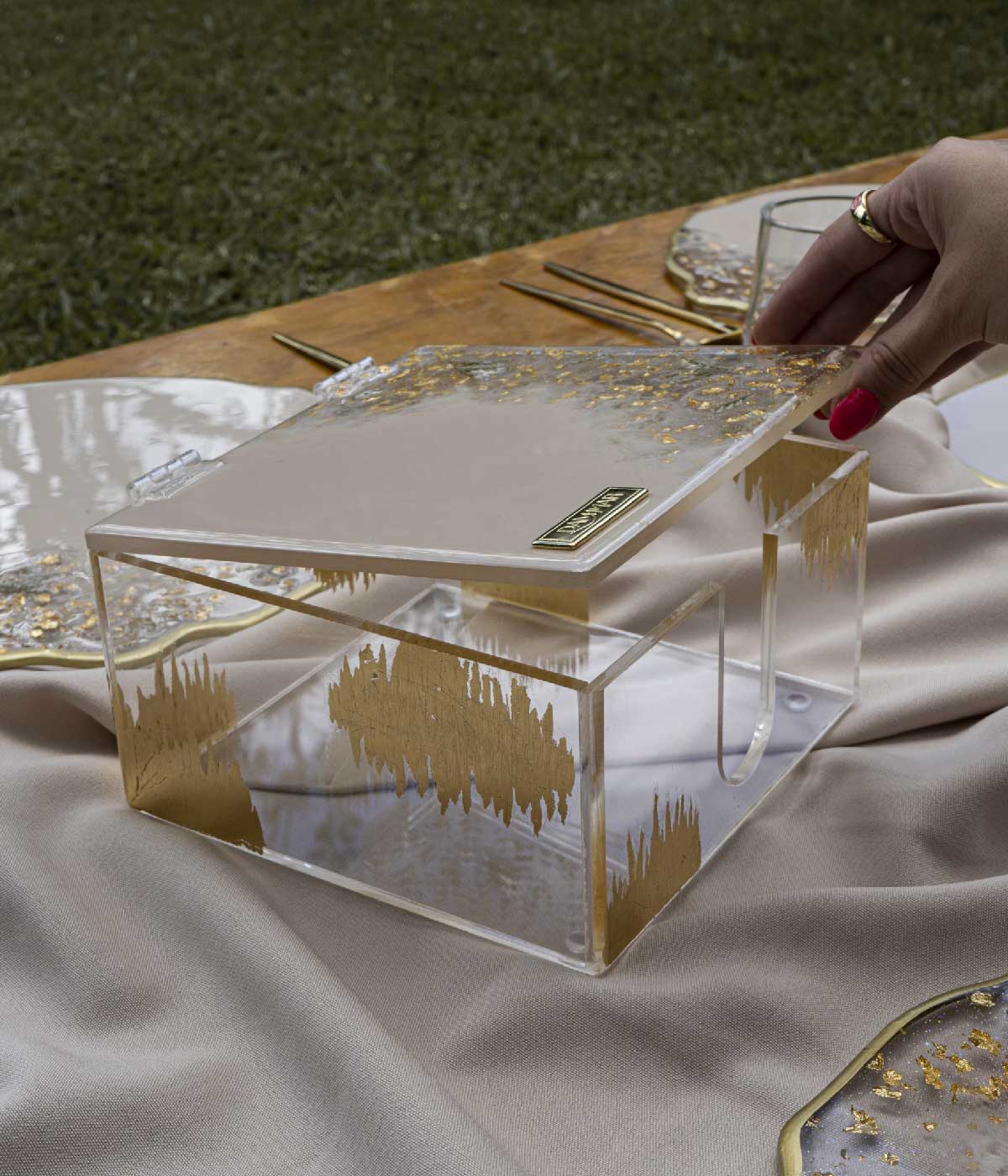 Espectacular servilletero en caja con un hermoso detalle en resina y flores naturales  en la tapa, es una delicada y única pieza hecha a mano. Consiste en un recipiente de resina transparente, en cuyo interior se encuentran hermosas w flores naturales preservada. tienen un aplique en laminilla dorada.