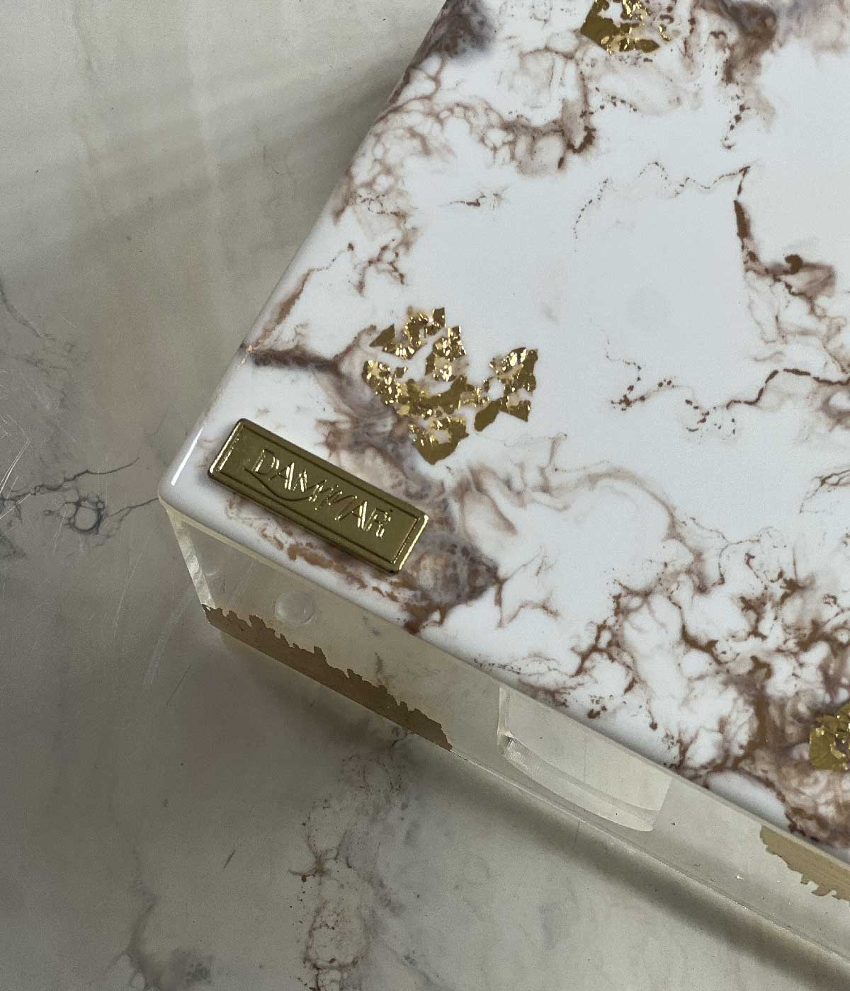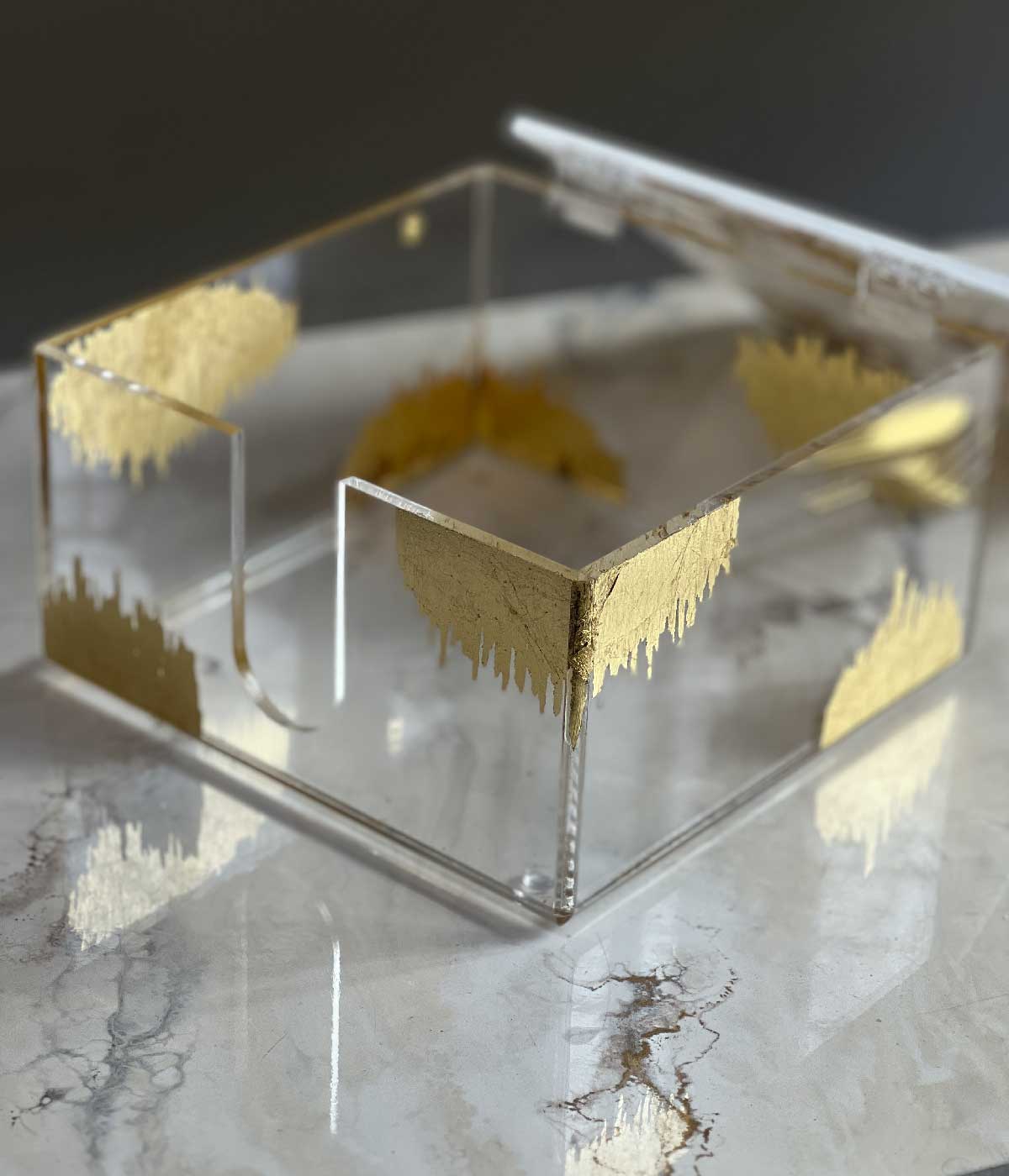 Espectacular servilletero en caja con un hermoso detalle en resina en la tapa, es una delicada y única pieza hecha a mano. Consiste en un recipiente de resina transparente,   tienen un aplique en laminilla oro.