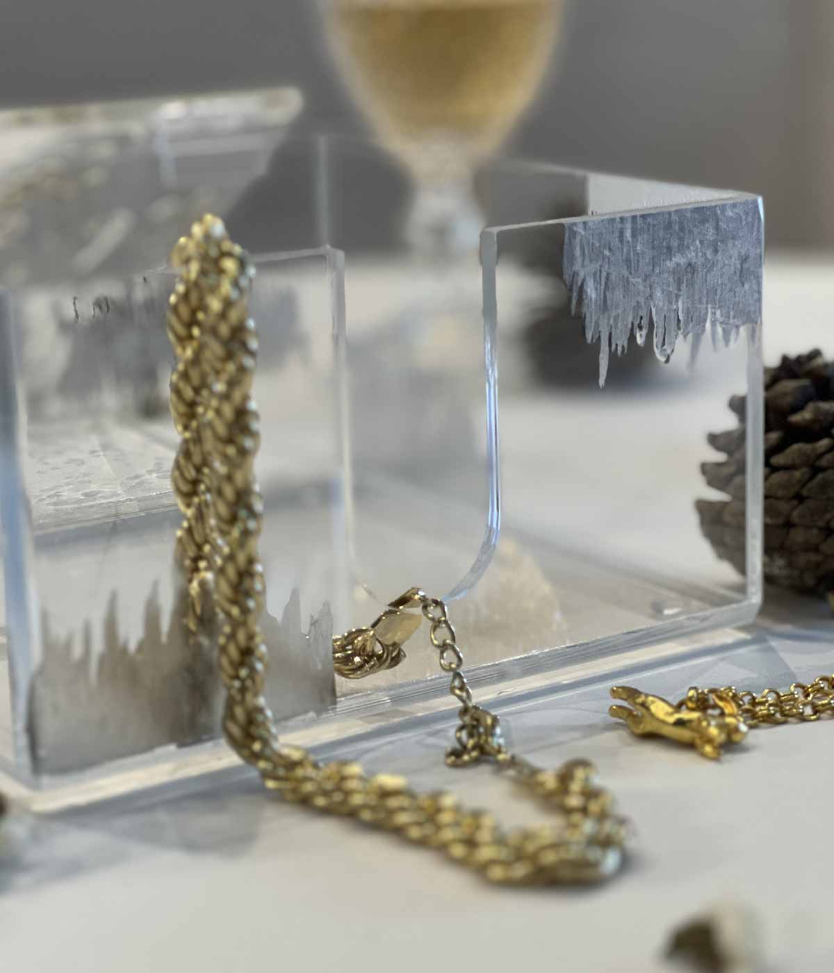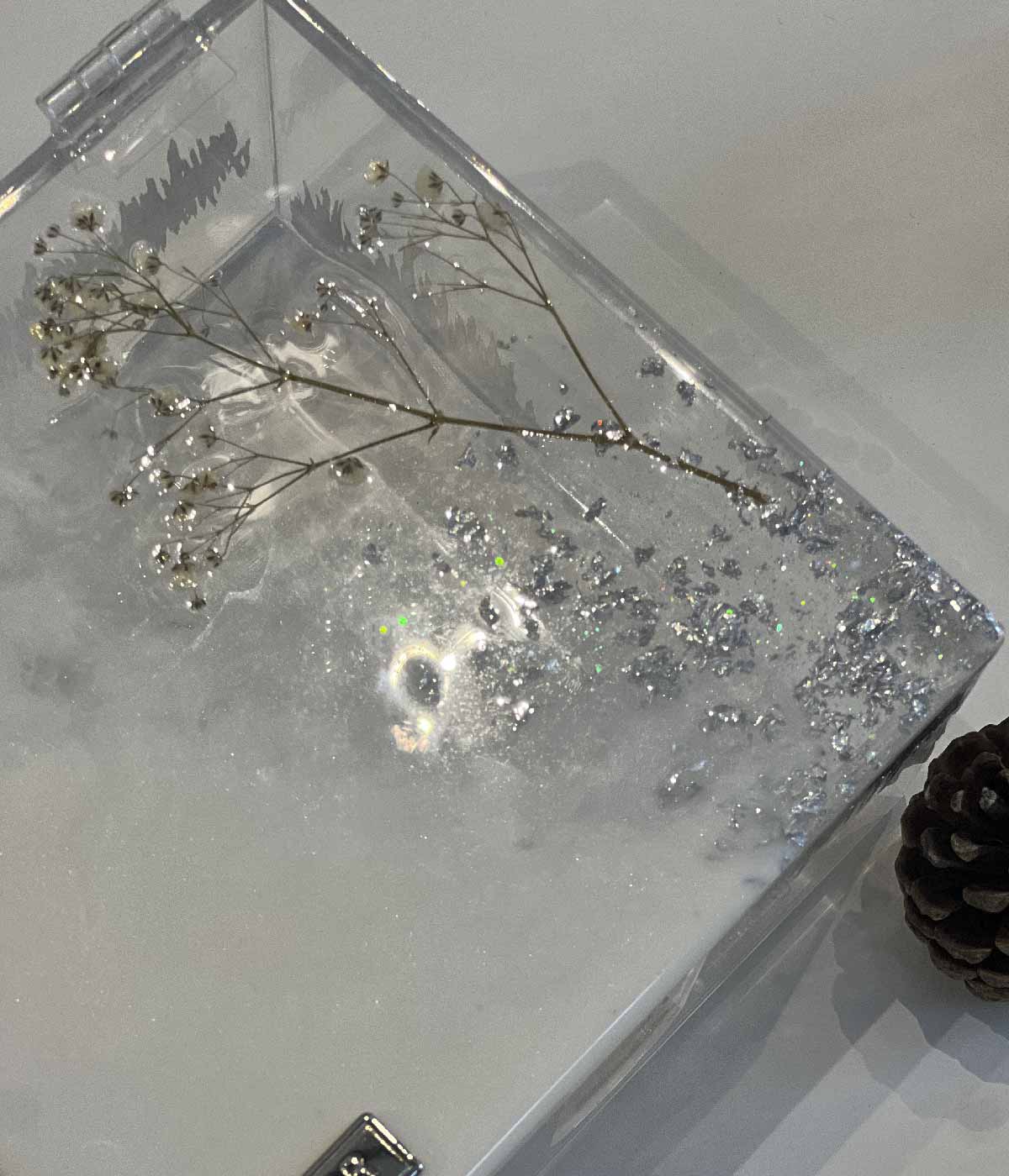Espectacular servilletero en caja con un hermoso detalle en resina y flor natural  en la tapa, es una delicada y única pieza hecha a mano. Consiste en un recipiente de resina transparente, en cuyo interior se encuentra una hermosa flor natural preservada. tienen un aplique en laminilla bronce.
