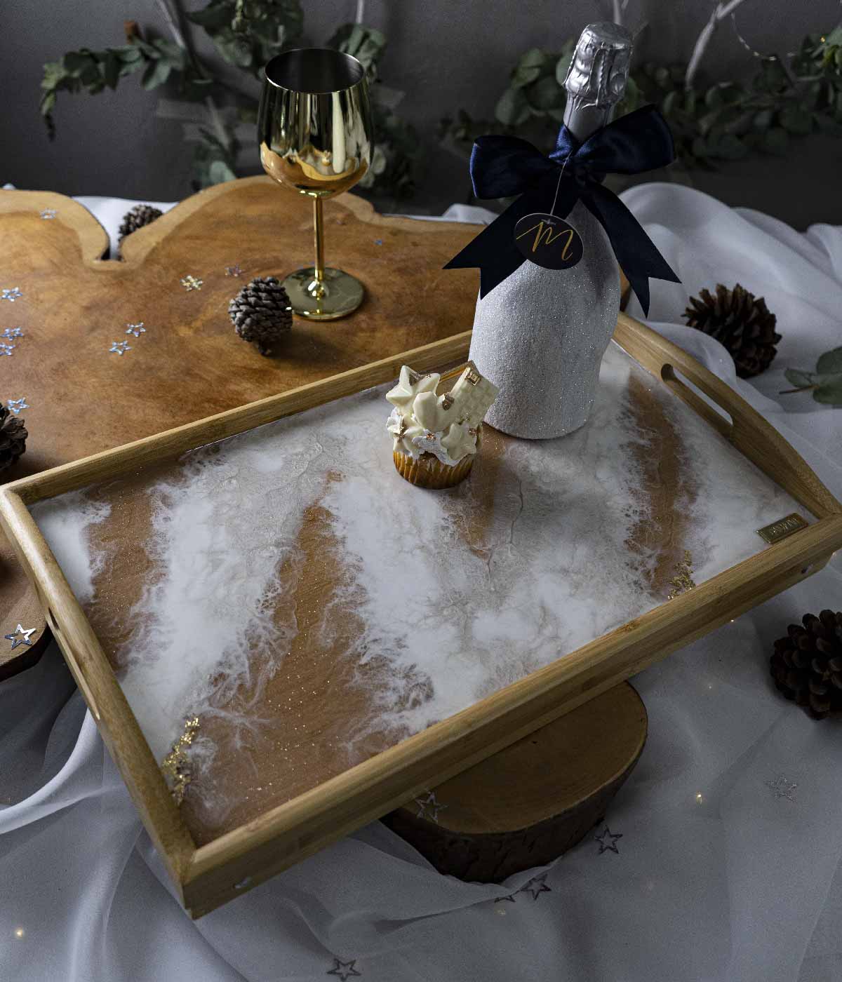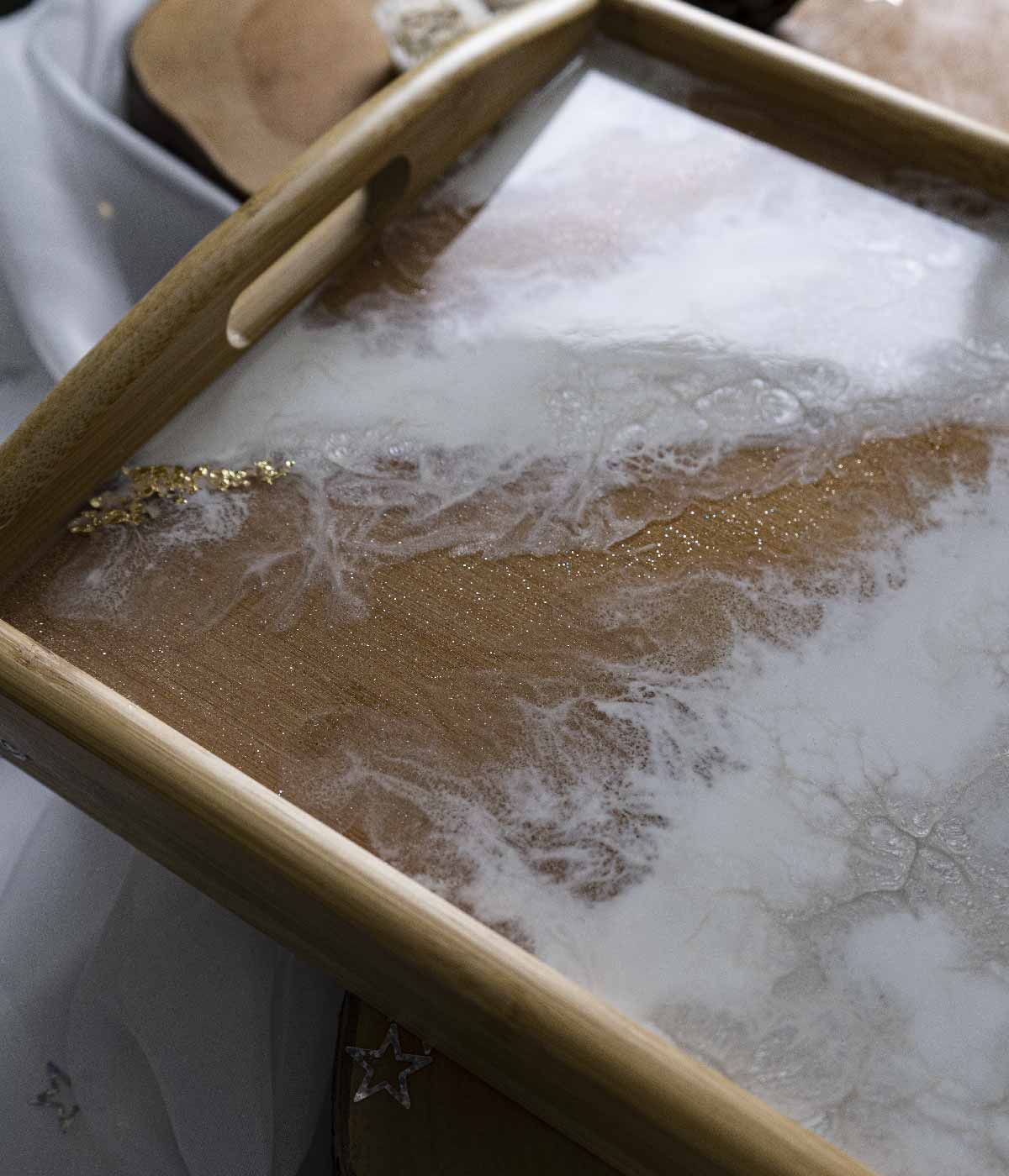 Hermosa mesa de cama para desayunar o trabajar con mayor comodidad. Medidas: 50x30 cm Material: Resina y bambú Personalízalo en los colores que tu elijas Hecho a mano
