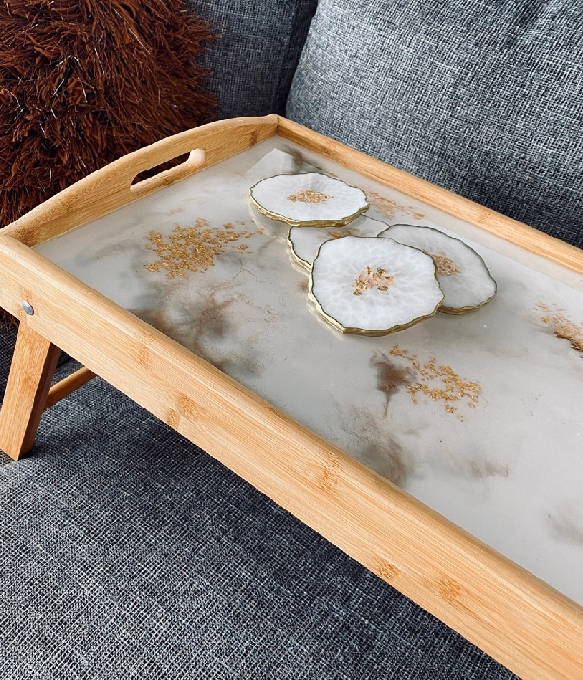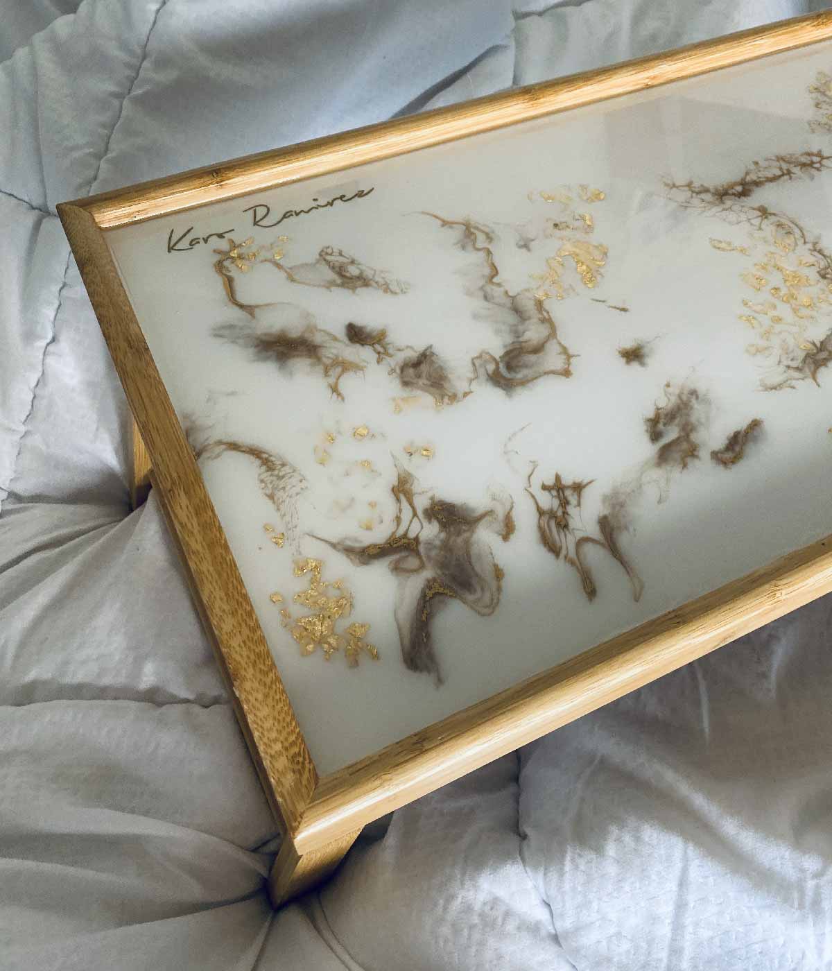 Esta hermosa y exclusiva mesa será tu mejor amiga cuando desees desayunar o trabajar en la comodidad de tu cama o sofá. Medidas: 50x30 cm Material: Resina y bambú Hecho a mano