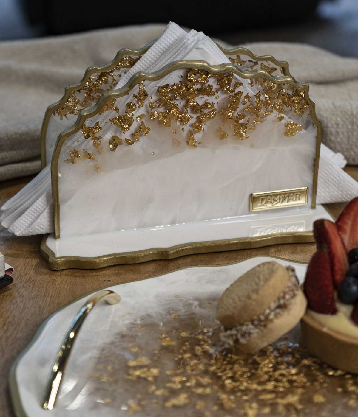 Hermoso servilletero irregular en color blanco tiza con transparencia y laminilla oro Material: Resina Hecho a mano