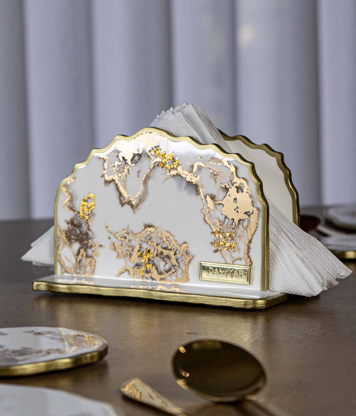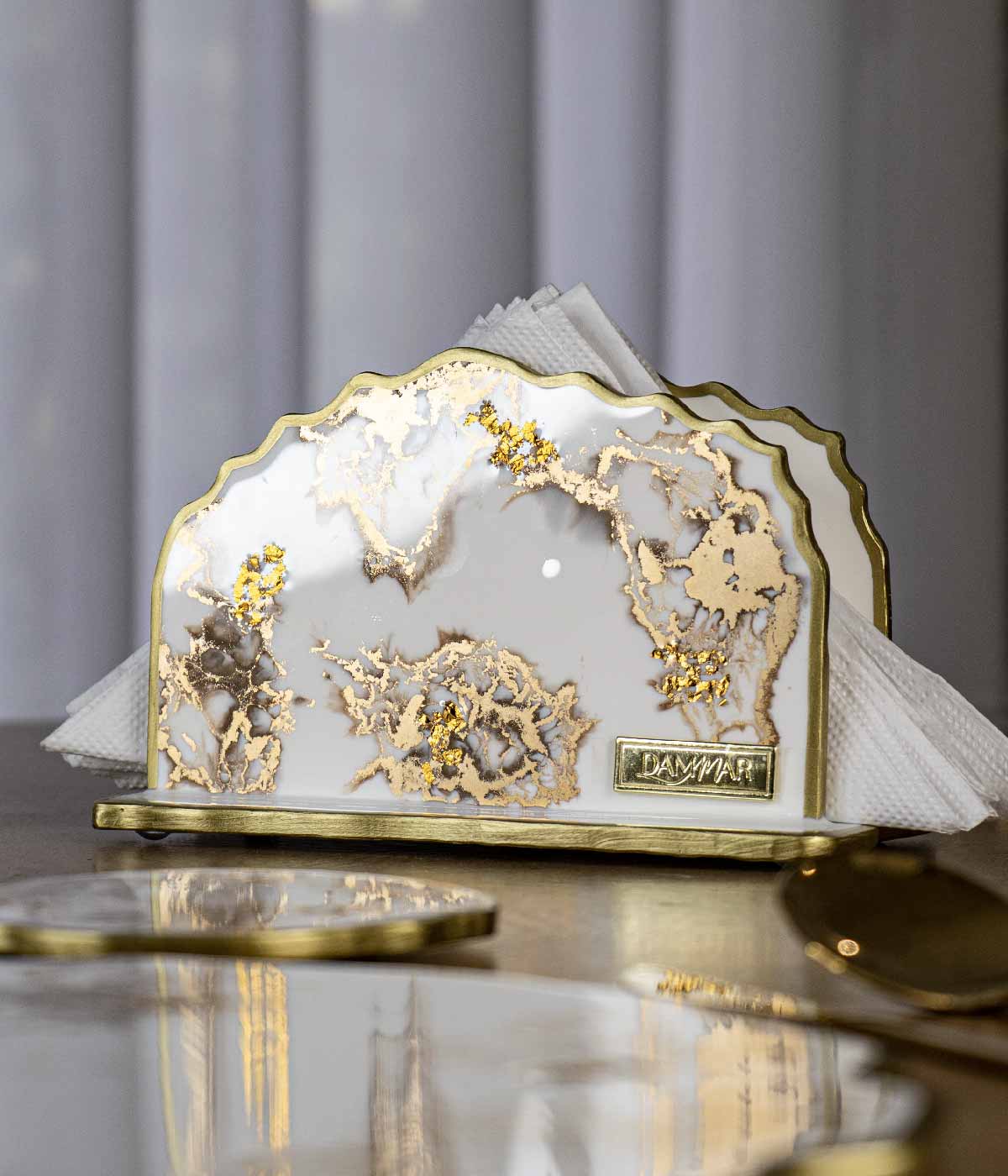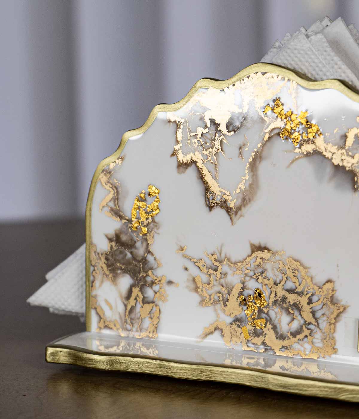 Hermoso servilletero irregular en color blanco tiza con transparencia y laminilla oro Material: Resina Hecho a mano