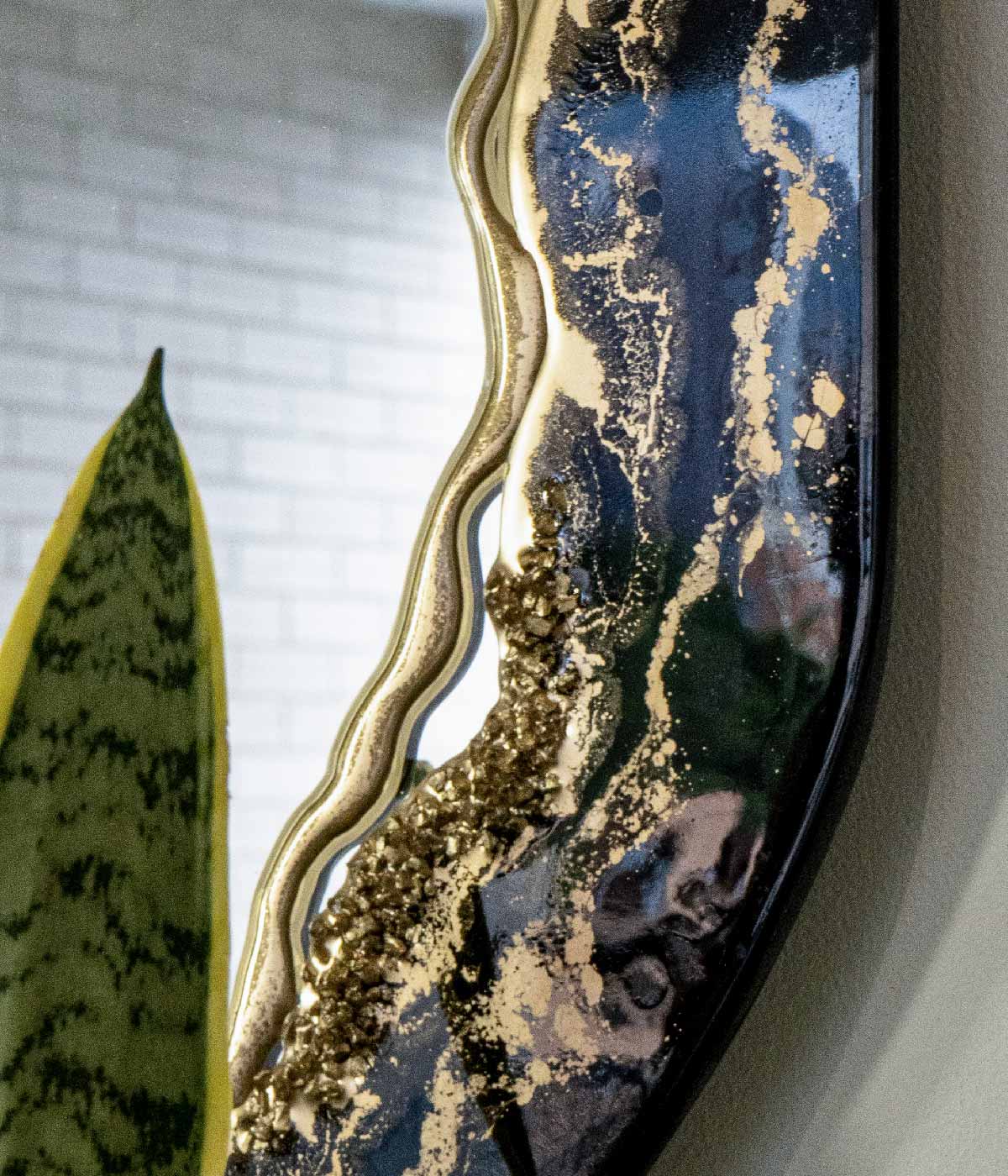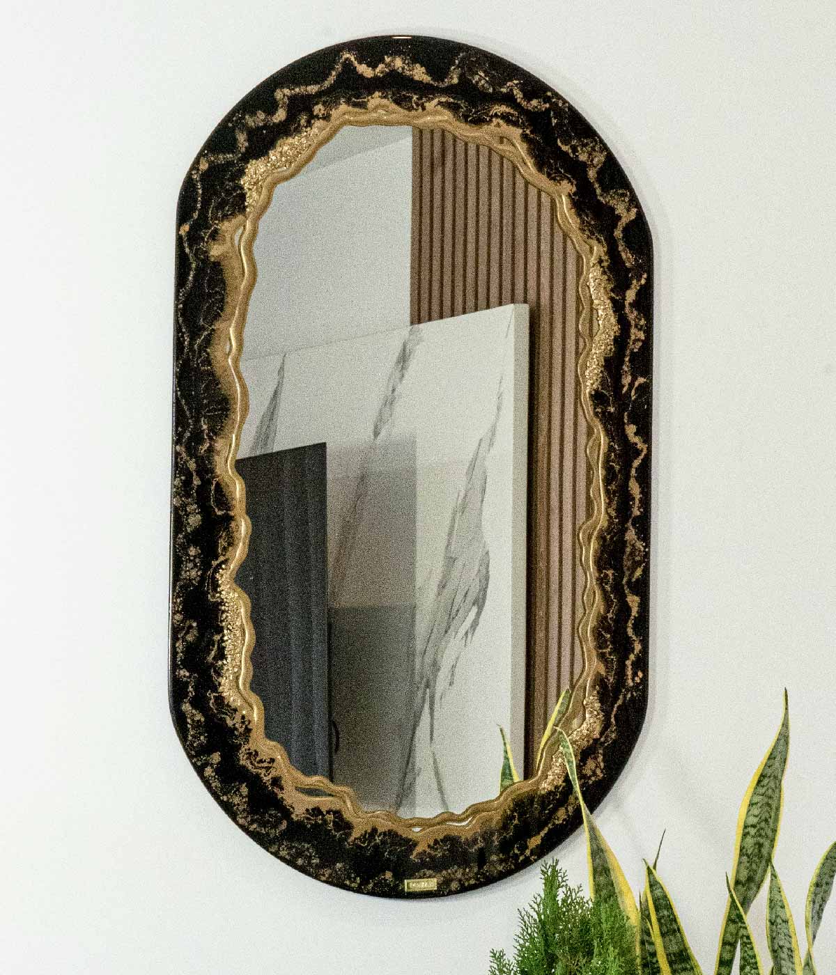Hermoso espejo ovalado de pared perfecto para complementar tus espacios en colores negro, dorado y lineas en relieve.
