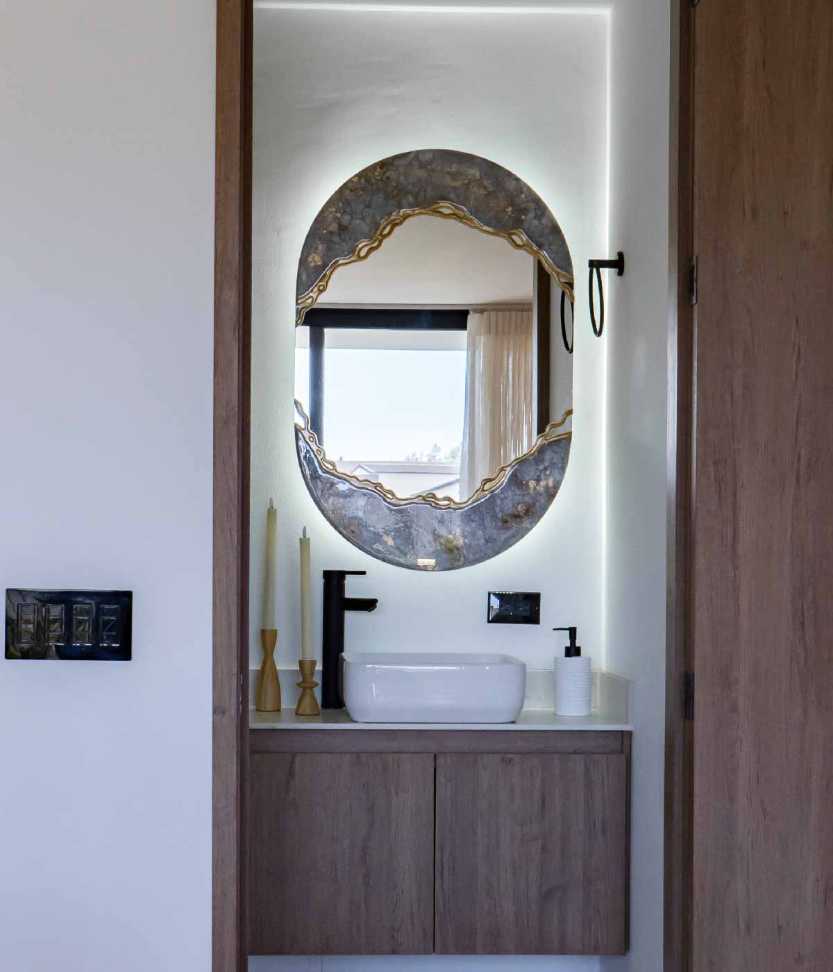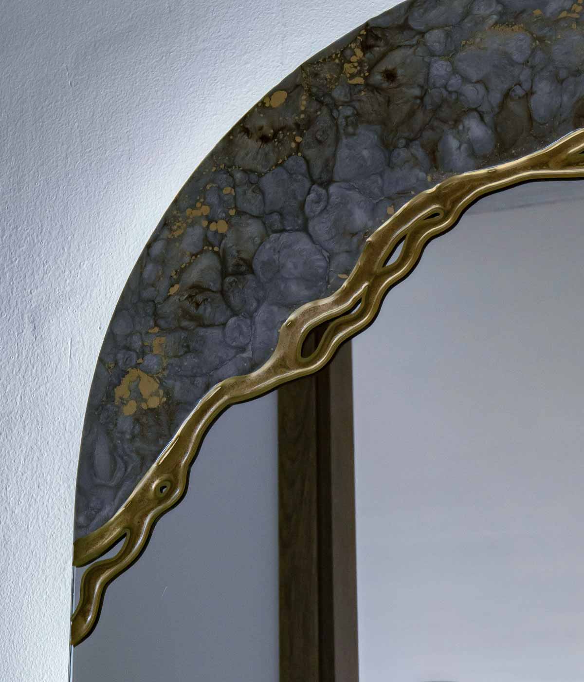 Hermoso espejo ovalado de pared perfecto para complementar tus espacios en colores gris, nácar, blanco, dorado y líneas en relieve doradas.