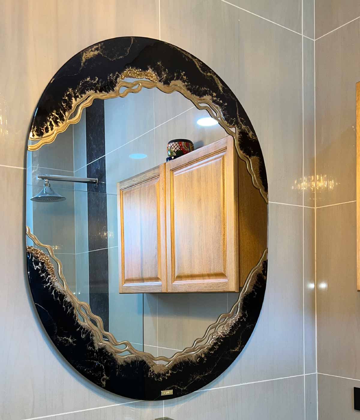 Hermoso espejo ovalado de pared perfecto para complementar tus espacios en colores negro, dorado y lineas en relieve.