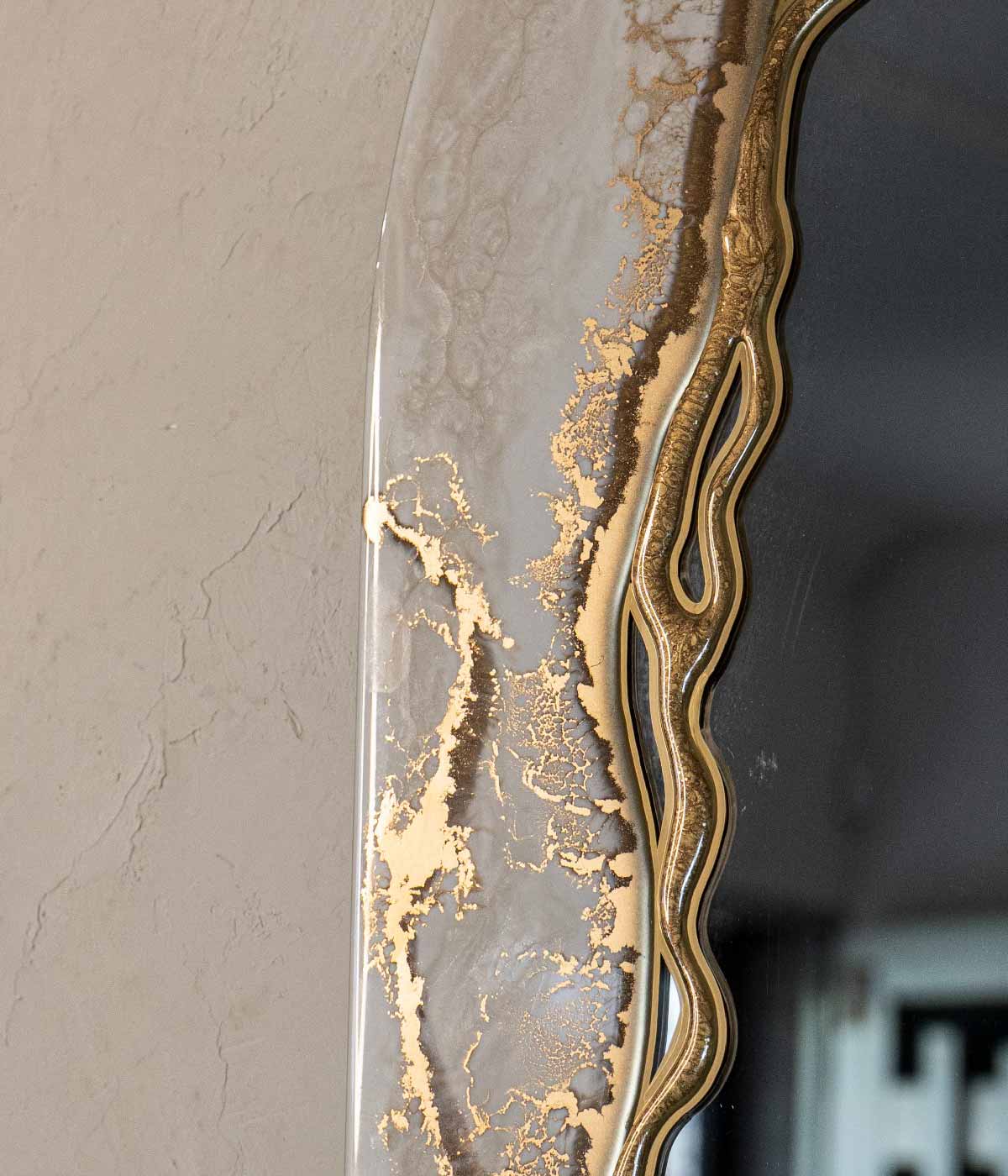 Hermoso espejo ovalado de pared perfecto para complementar tus espacios en colores blanco, nácar, dorado y lineas en relieve.