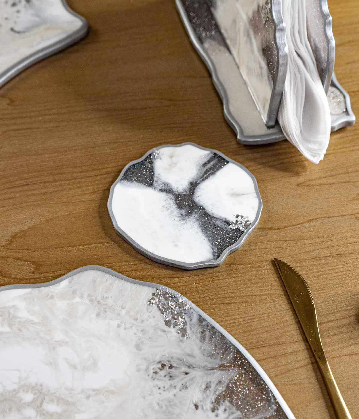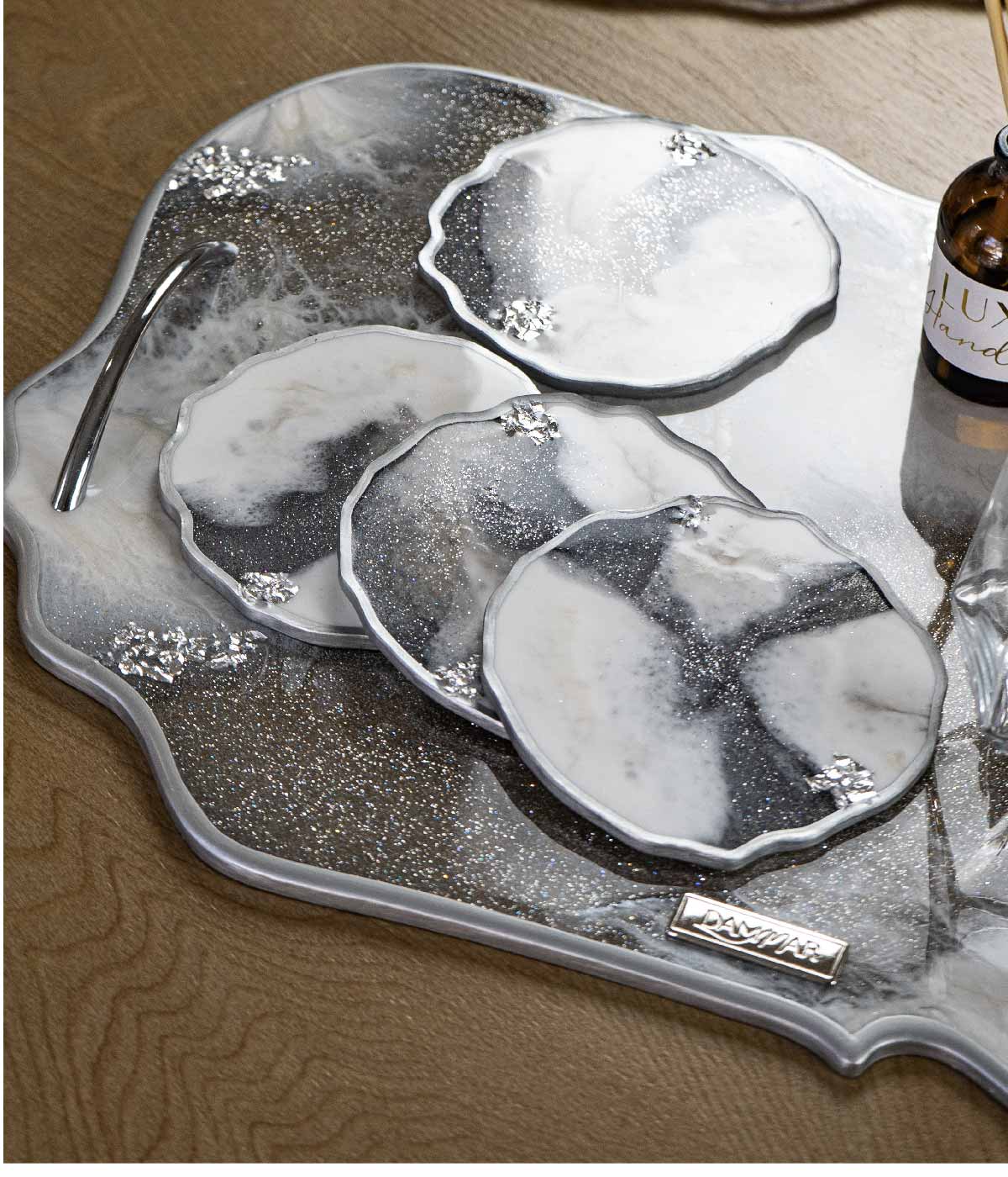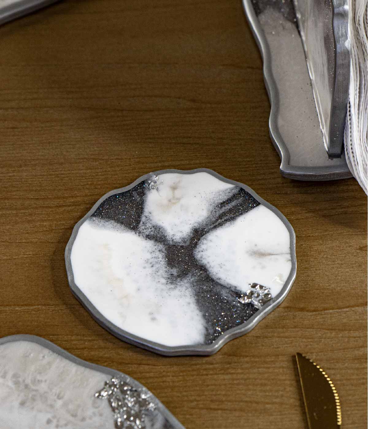 Hermosos portavasos en colores blanco y nácar con lineas plateadas, ideales para dar un estilo único y elegante a tu mesa.
